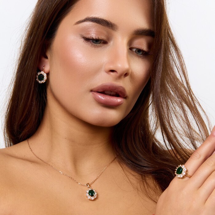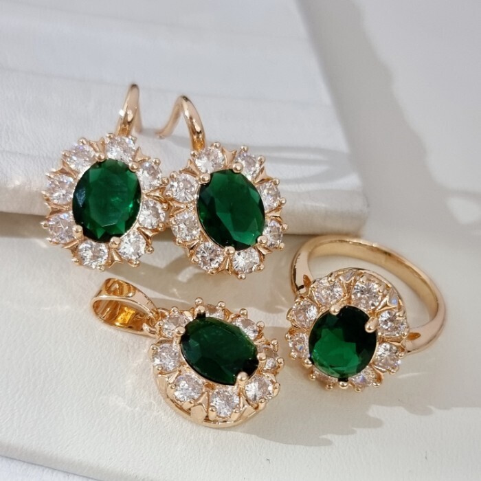 Комплект ювелирной бижутерии коллекция "Дубай" серьги, кулон и кольцо 20 р, покрытие позолота, вставка: фианиты, цвет: зеленый и прозрачный, арт.414.186-20