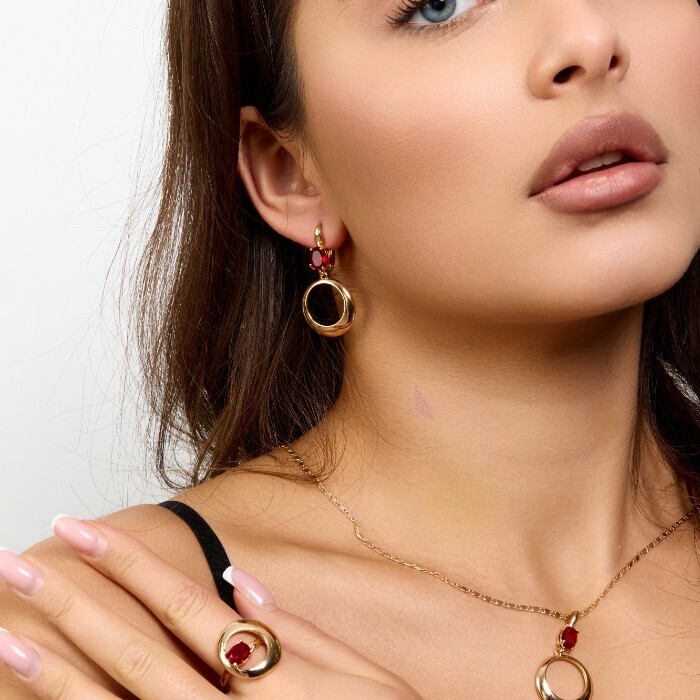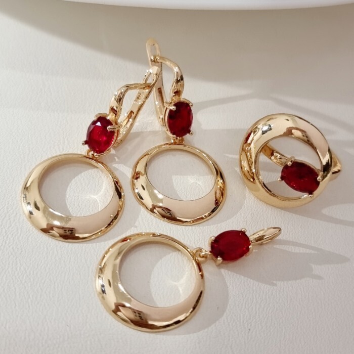 Комплект ювелирной бижутерии коллекция "Дубай" серьги, кулон и кольцо 20 р, покрытие позолота, вставка: фианиты, цвет: красный, арт.217.480-20