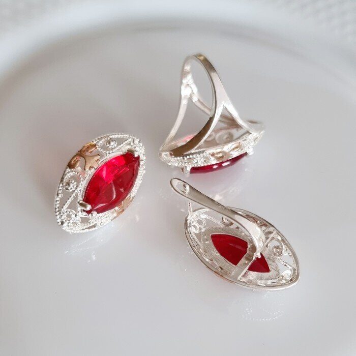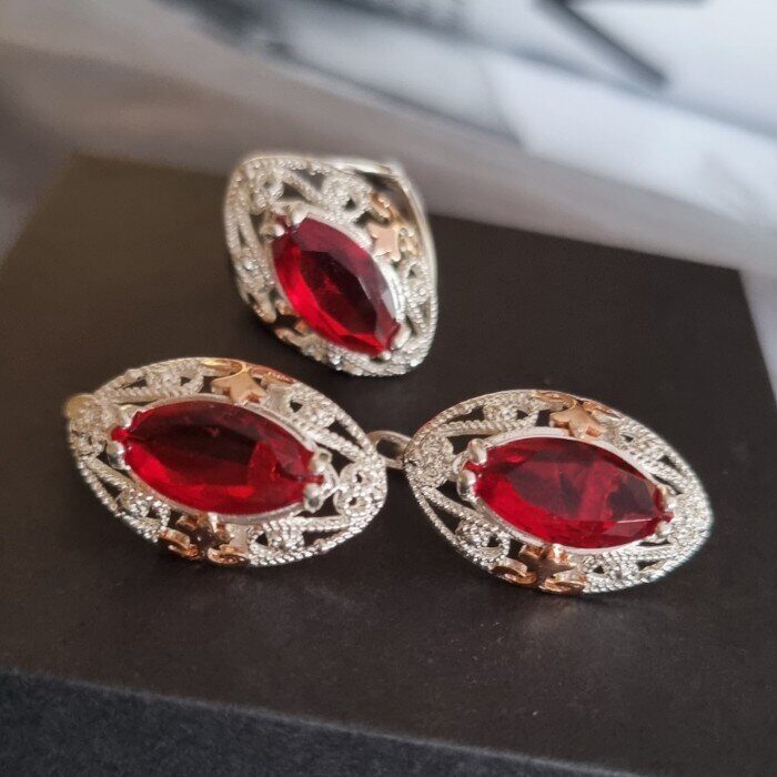 Описание Размер кольца: 18. Размер серёжек: 2,2*1,5 см. Замок: английский. Материал: бижутерный сплав, камни. Вес: 14 гр. Комментарии к товару