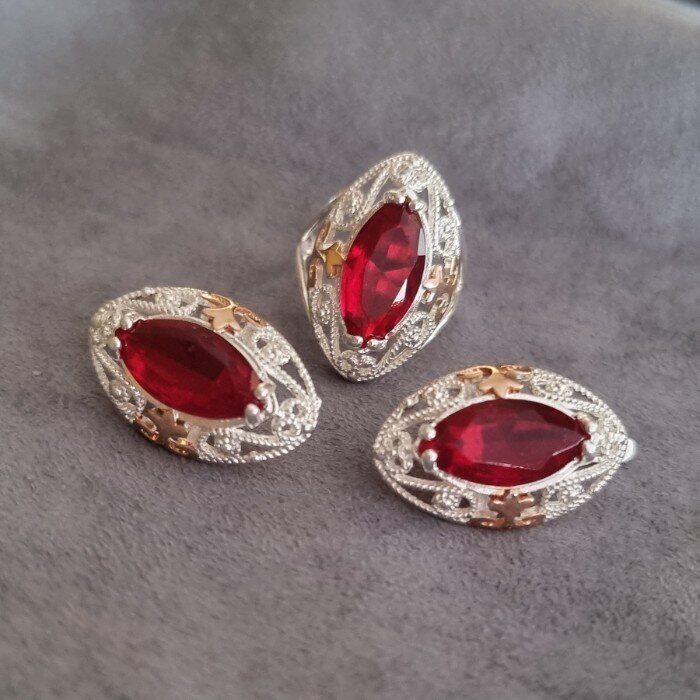 Описание Размер кольца: 19,5. Размер серёжек: 2,2*1,5 см. Замок: английский. Материал: бижутерный сплав, камни. Вес: 14 гр. Комментарии к товару