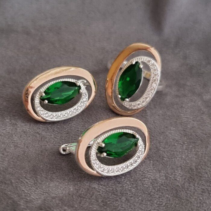 Описание Размер кольца: 16,5. Размер серёжек: 2,5*1,5 см. Замок: английский. Материал: бижутерный сплав, камни. Вес: 11 гр. Комментарии к товару