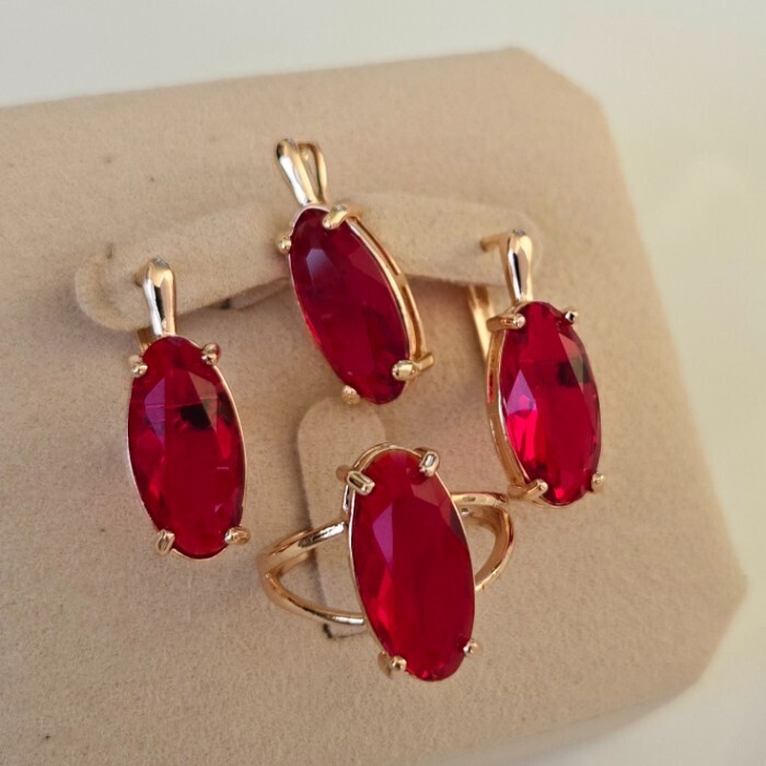 Комплект ювелирной бижутерии коллекция "Дубай"серьги, кулон и кольцо 20 р, покрытие позолота, вставка: фианит, цвет: красный, арт.216.411-20