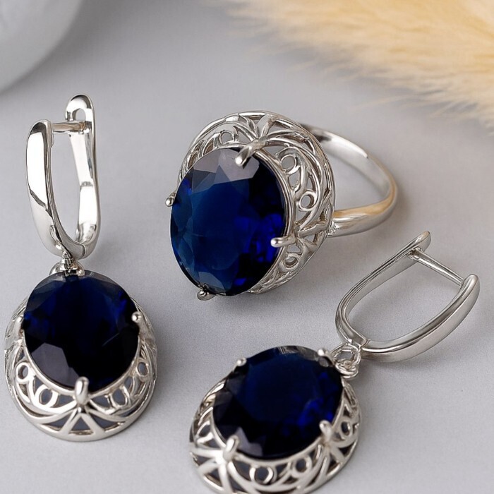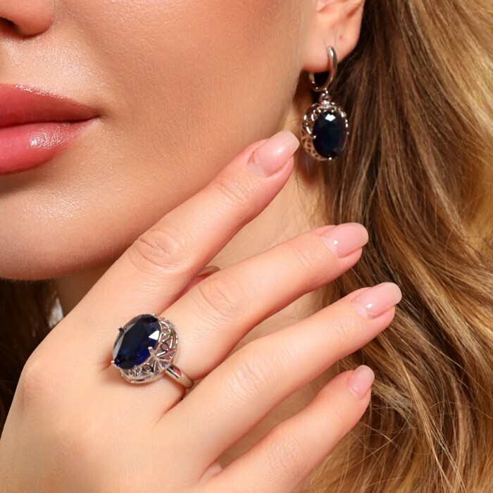 Комплект ювелирной бижутерии с крупным камнем серьги и кольцо 17 р, цвет: синий, арт.213.918-17