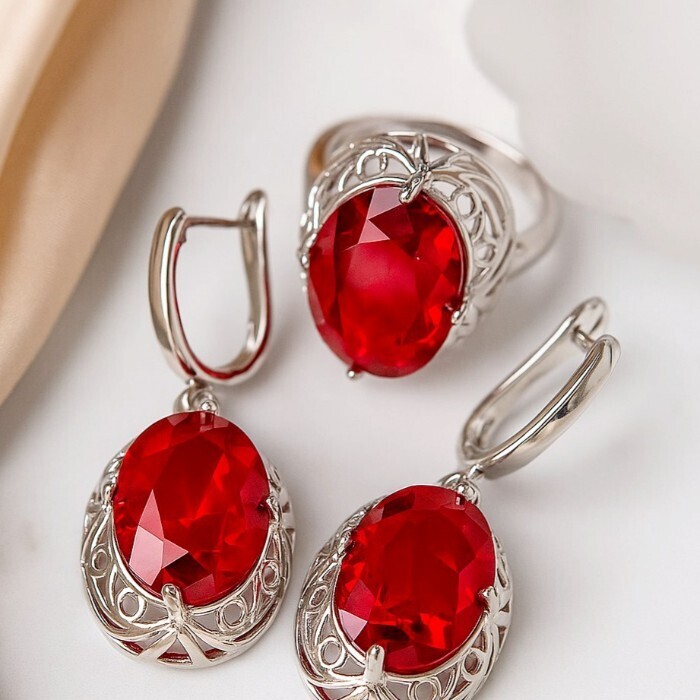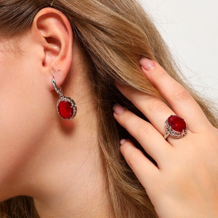 Комплект ювелирной бижутерии с крупным камнем серьги и кольцо 18 р, цвет: красный, арт.213.916-18
