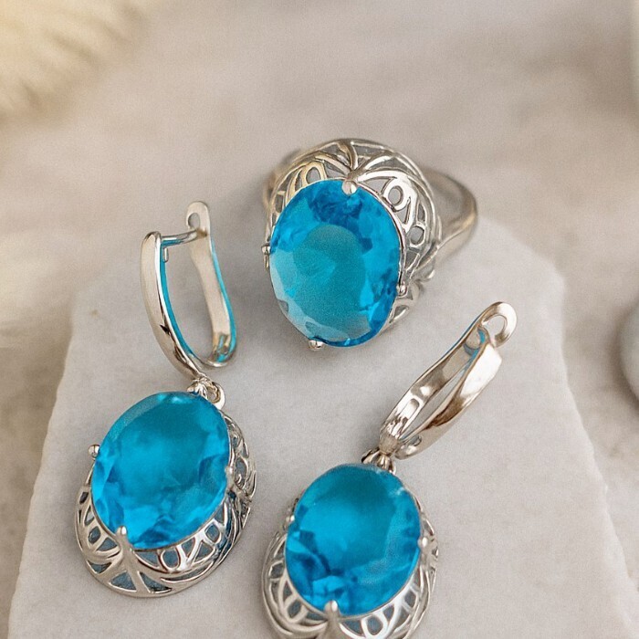Комплект ювелирной бижутерии с крупным камнем серьги и кольцо 20 р, цвет: голубой, арт.213.920-20