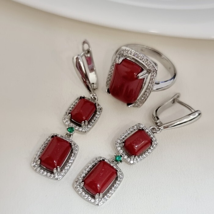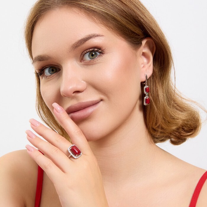 Комплект ювелирной бижутерии серьги и кольцо 17 р, покрытие посеребрение, вставка: фианиты и искусственный камень, цвет: бордовый и прозрачный, арт.313.156-17
