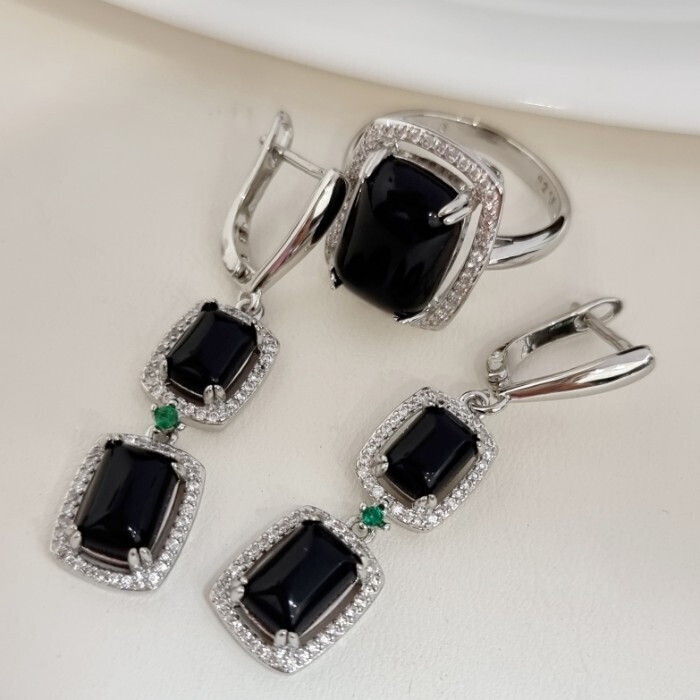 Комплект ювелирной бижутерии серьги и кольцо 18 р, покрытие посеребрение, вставка: фианиты и искусственный камень, цвет: черный и прозрачный, арт.313.159-18