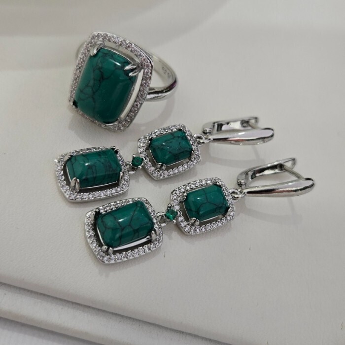 Комплект ювелирной бижутерии серьги и кольцо 18 р, покрытие посеребрение, вставка: фианиты и искусственный камень, цвет: зеленый и прозрачный, арт.313.321-18