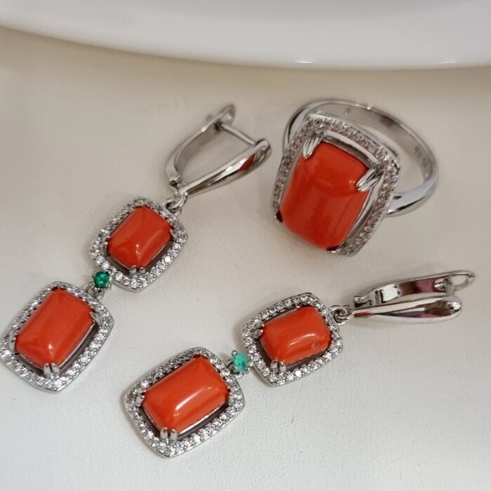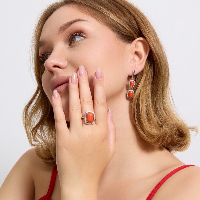 Комплект ювелирной бижутерии серьги и кольцо 20 р, покрытие посеребрение, вставка: фианиты и искусственный камень, цвет: оранжевый и прозрачный, арт.313.155-20