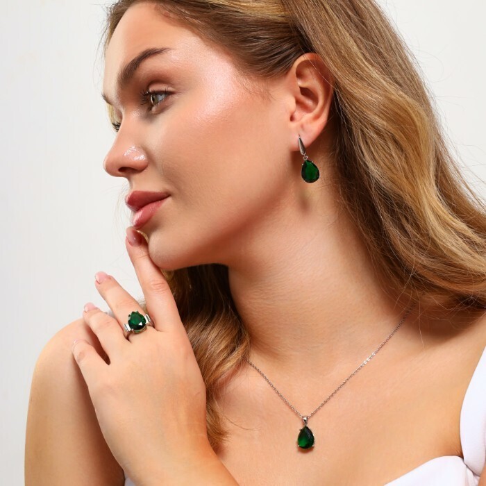 Комплект ювелирной бижутерии серьги, кулон и кольцо 20 р, покрытие: посеребрение, вставка: фианит, цвет: зеленый, арт.213.895-20