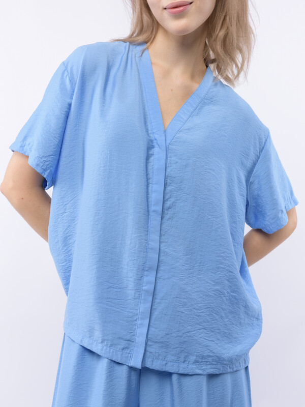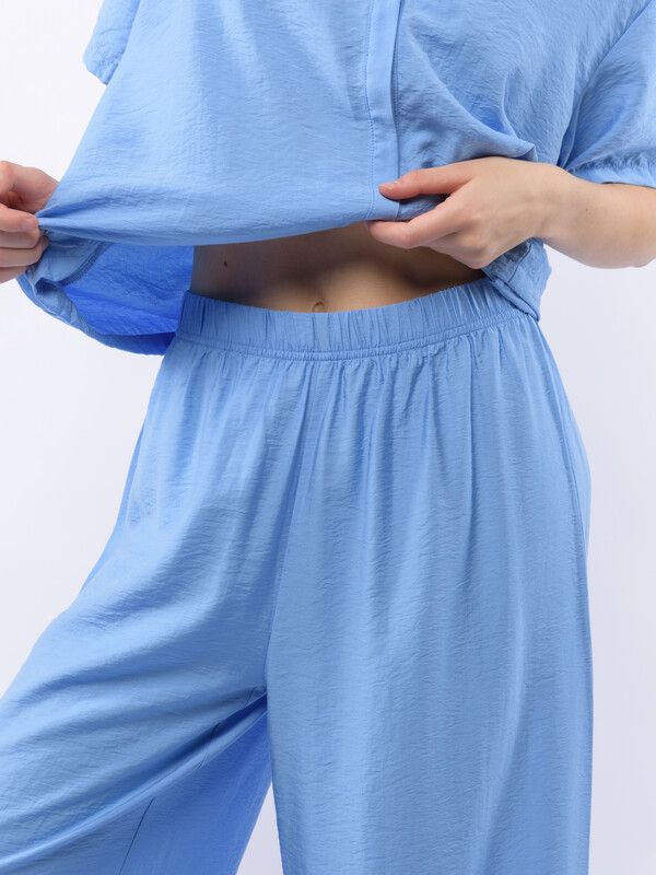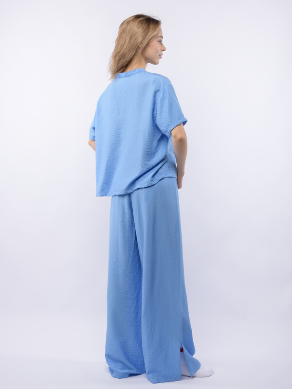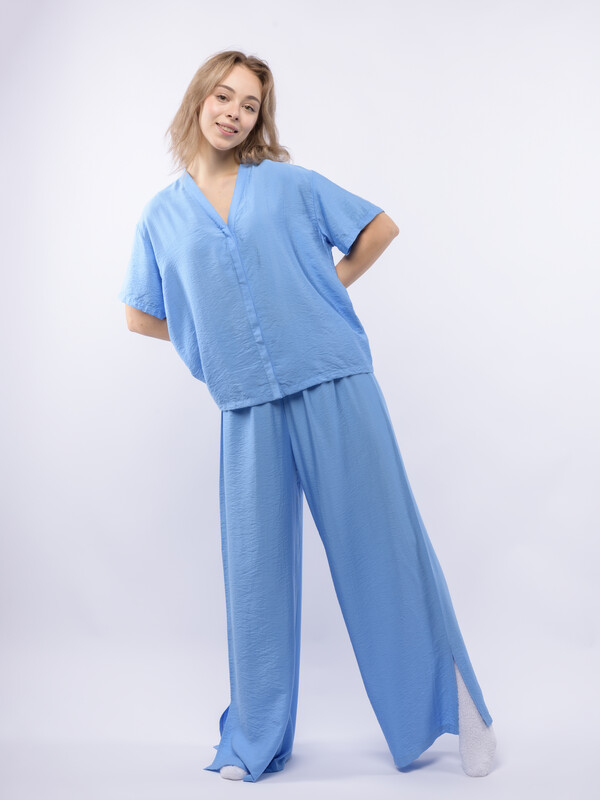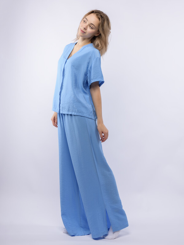 Домашний костюм из вискозы с крэш эффектом (жатый материал) состоит из рубашки и широких брюк. Рубашка с V-образным вырезом и супатной (скрытой) застежкой на пуговицы, с коротким рукавом. Широкие брюки на резинке. В боковых срезах брюк разрезы. Подгиб и строчка по низу рукава и рубашки и низу брюк. XS-XS(170-84-90), S-S(170-88-94), M-M(170-92-98), L-L(170-96-102), XL-XL(170-100-106)