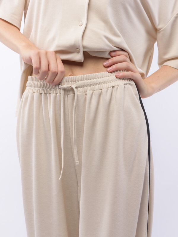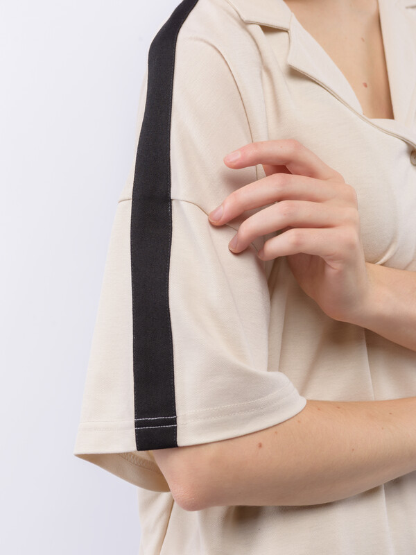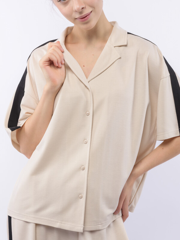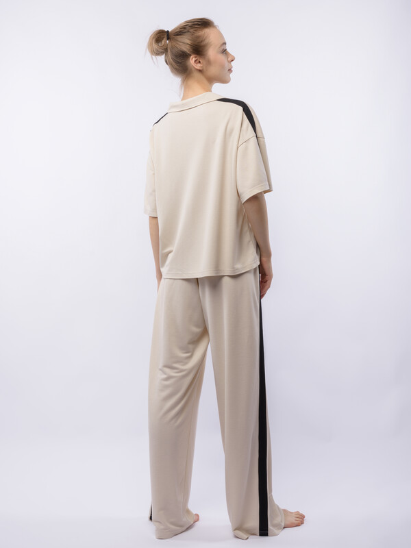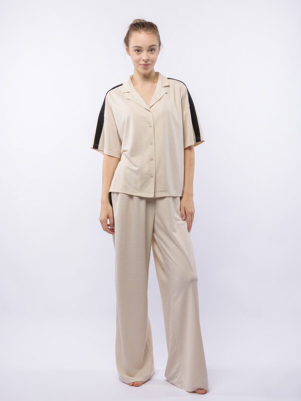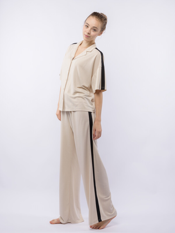 Производитель: Sensera Домашний костюм из плотного эластичного трикотажа бежевого цвета состоит из рубашки и длинных брюк. Рубашка с английским воротником, на пуговицах, с коротким рукавом. По плечу и рукаву широкий контрастный черный лампас. Широкие брюки на резинке и со шнурком. Широкий контрастный черный лампас по внешней стороне по всей длине брючины. Подгиб и строчка по низу рукава и рубашки и низу брюк.  XS-XS(170-84-90), S-S(170-88-94), M-M(170-92-98), L-L(170-96-102), XL-XL(170-100-106)