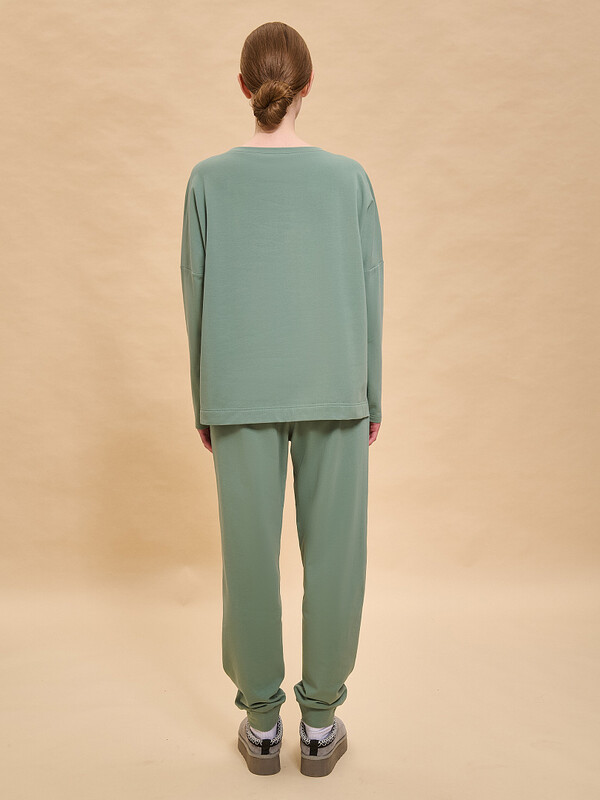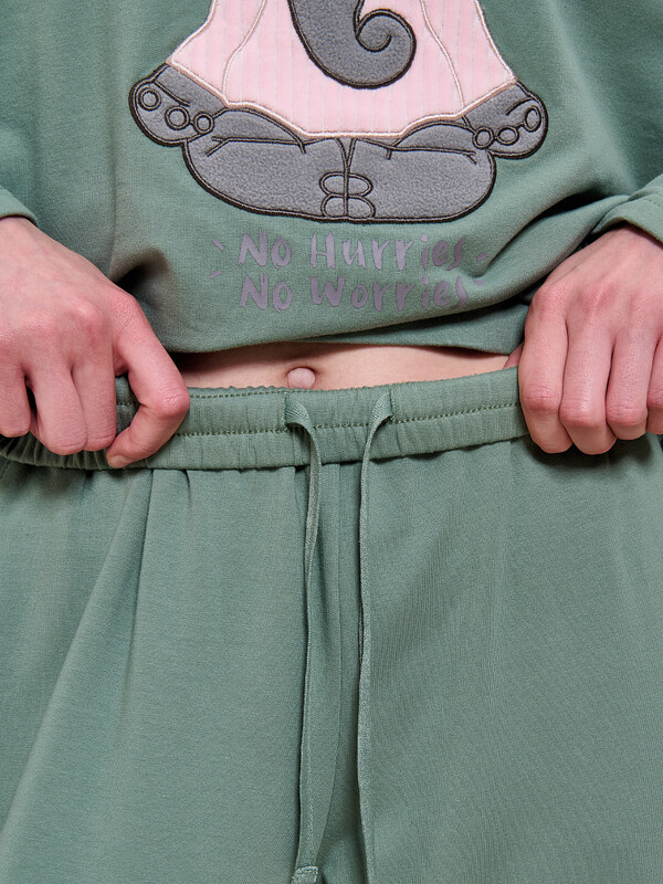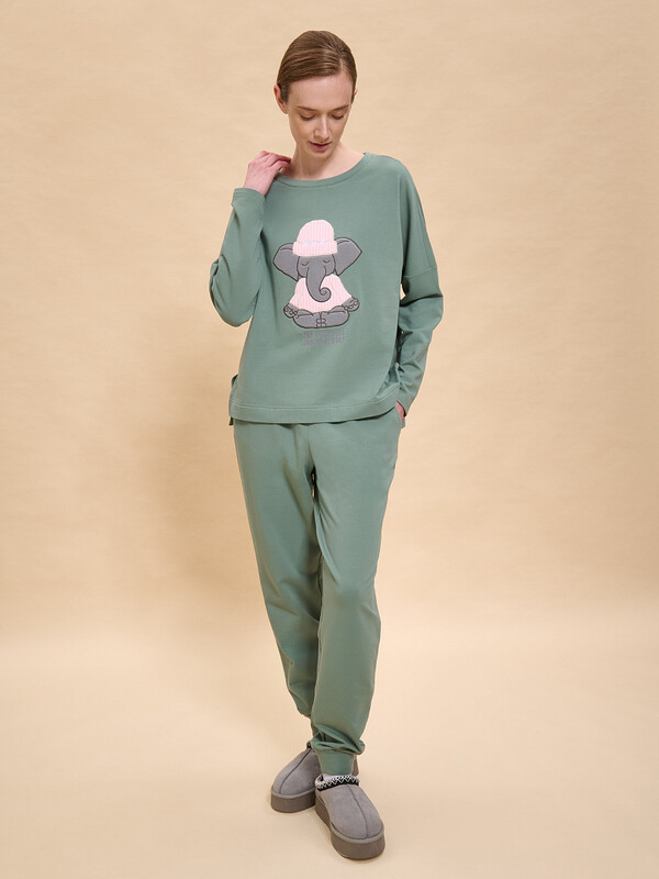 Теплая пижама женская. В составе ткани (футер с начёсом) преобладает высококачественный хлопок — комплект для сна мягкий, гипоаллергенный и хорошо пропускает воздух. В хлопковой пижаме вам будет тепло и уютно во время сна. Эластан помогает модели надолго сохранить первоначальную форму. Джемпер и брюки умеренного объёма, плечо джемпера спущено, спинка чуть длиннее переда— в пижаме очень удобно спать. В поясе брюк мягкая и широкая резинка — не перекручивается и не давит. Отделка горловины из эластичной рибаны — она не растягивается, пижаму удобно надевать и снимать. Хлопковая пижама украшена милым, «няшным» принтом в виде медитирующего слоника, надписи переводятся: «никакой спешки», «не беспокойтесь» — почувствуйте себя уютно и беззаботно. Шляпка и майка слоника — аппликация из тактильного приятного бербер-флиса с нежной фактурой барашка. Пижамный костюм неприхотлив в уходе. Принт эластичный и мягкий, хорошо переносит частые стирки. Пижама женская с брюками подходит как для сна, так и просто для отдыха дома. Помните о правильном уходе за изделием: рекомендуется стирать при температуре не выше 30 °C, без предварительного замачивания, с изнанки. Это поможет сохранить качество и цвет пижамы на длительное время.