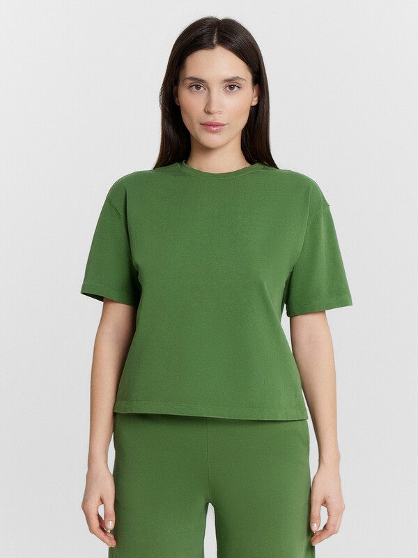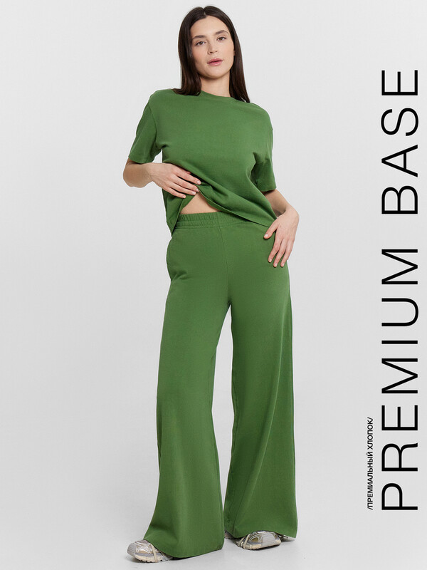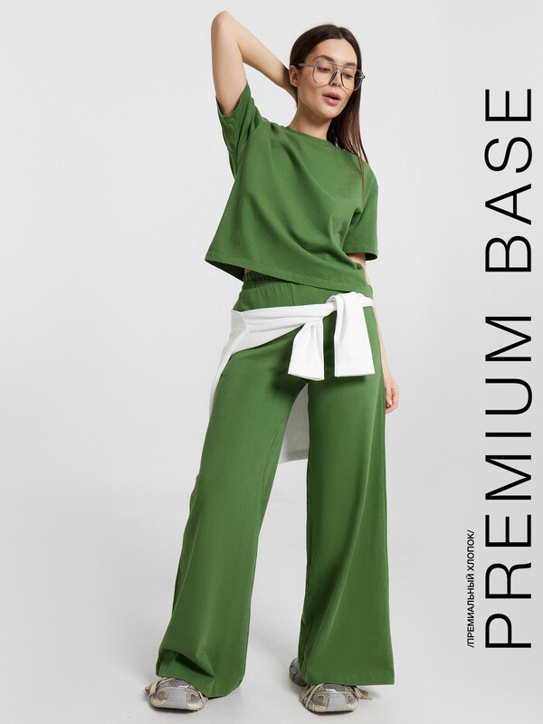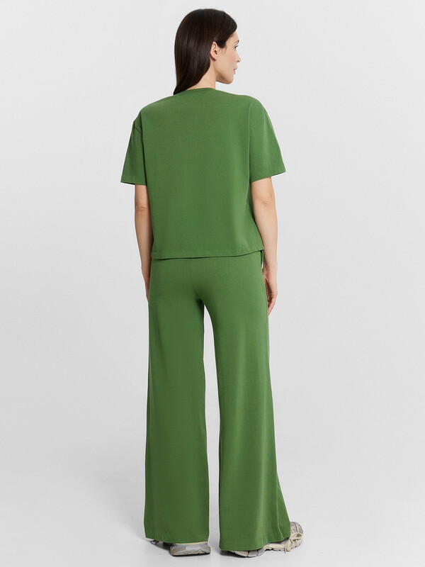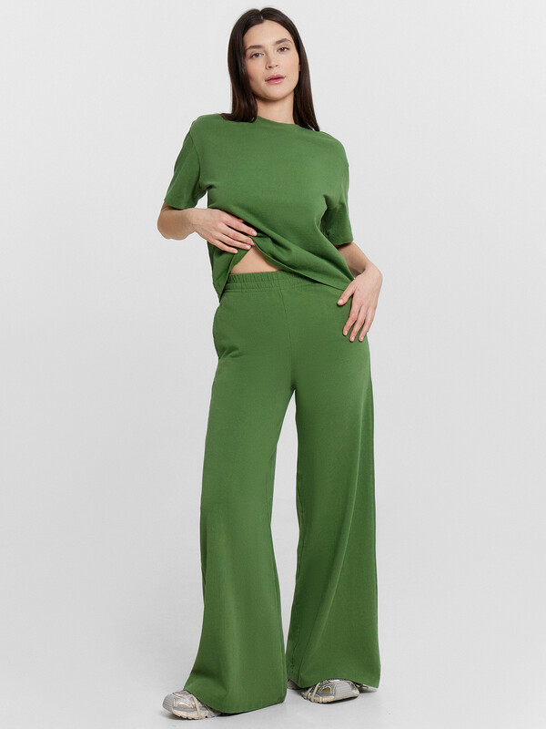 Производитель: Mark Formelle Женский комплект Mark Formelle - удачное вложение в ваш гардероб. Футболка имеет свободный силуэт с круглой горловиной и спущенными плечами, что придает ей расслабленный и стильный вид. Углубленная пройма и короткие рукава обеспечивают дополнительный комфорт и свободу движений. Брюки свободного силуэта немного расширяются к низу, создавая элегантный и удобный образ. Эластичный пояс и боковые карманы делают брюки еще более практичными и удобными для повседневного ношения. Комплект выполнен из мягкой и приятной на ощупь хлопковой кулирки.