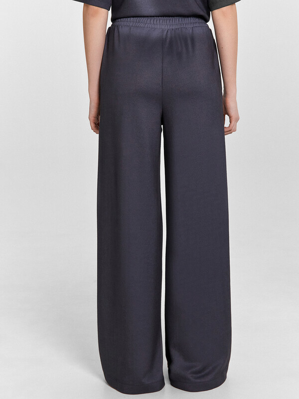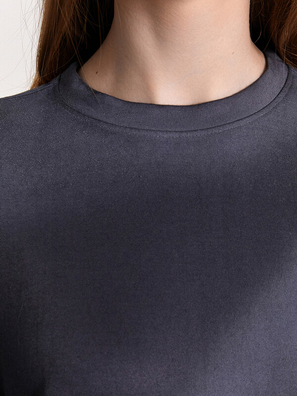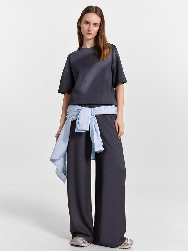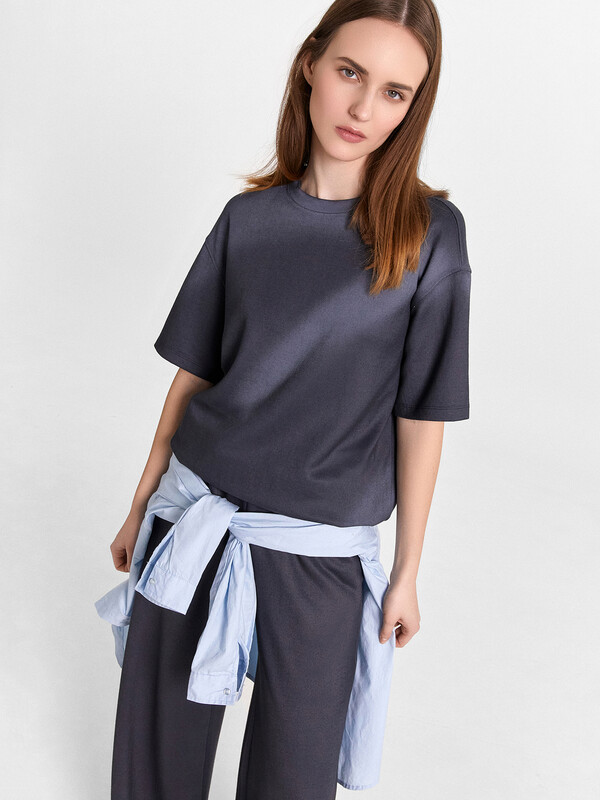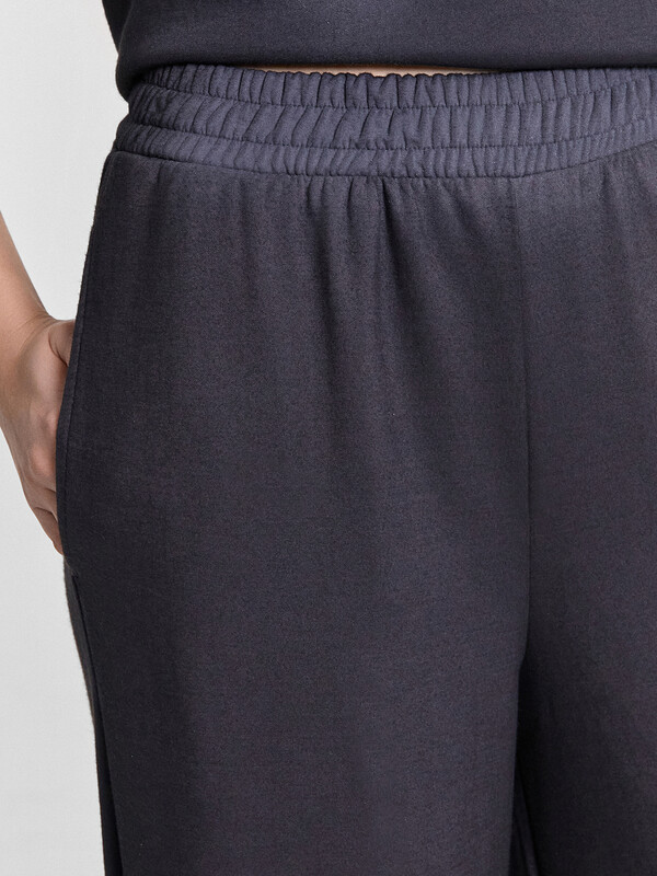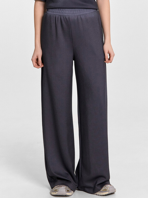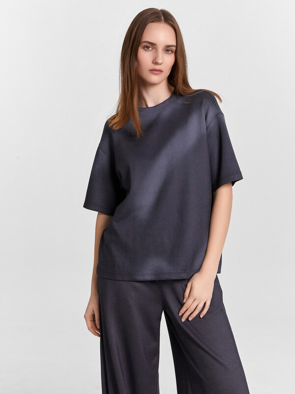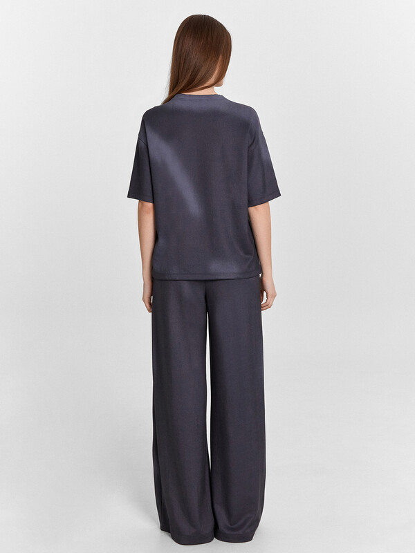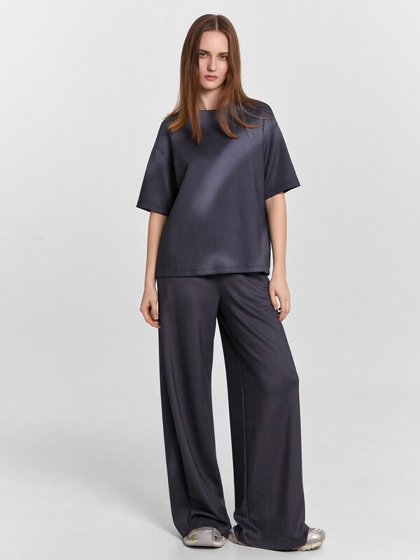 Джемпер свободного силуэта. Горловина круглой формы, обтачка из основного полотна. По горловине проложена отделочная строчка. Плечо спущено, пройма углублена. Рукав втачной короткий. Брюки свободного силуэта, немного расширяются к низу. Пояс отрезной, с эластичной тесьмой внутри. По поясу проложены отделочные строчки. В боковых швах обработаны карманы. Подкладка карманов из кулирки. Брюки полной длины. 52% полиэстер; 42% модал; 6% эластан Комментарии к товару