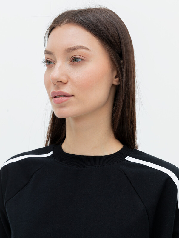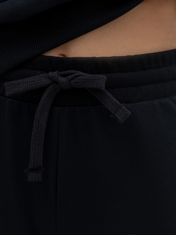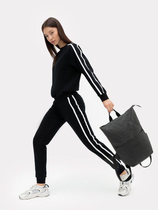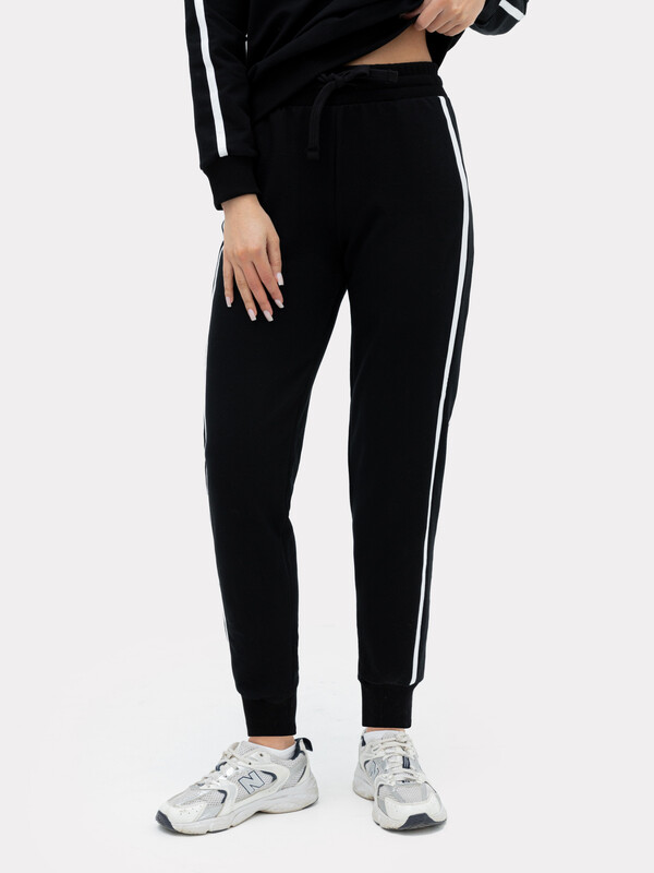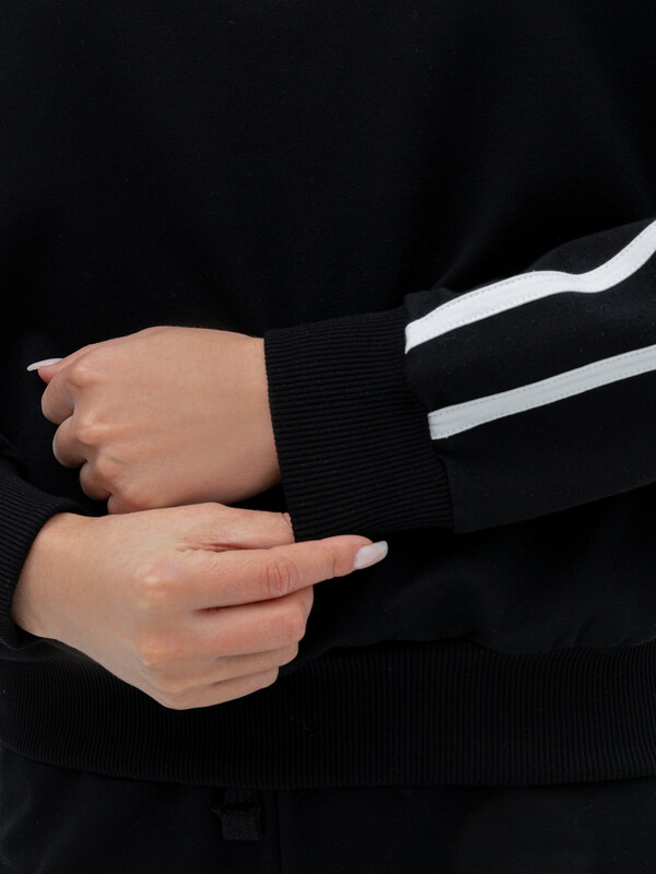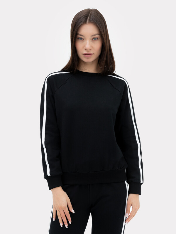 Спортивный комплект из футера без подчеса. В составе полотна – натуральный хлопок, немного полиэстера для прочности и эластана, который дарит свободу движений при нагрузках. Джемпер прямого силуэта, с длинными рукавами на манжетах, эластичным поясом на нижнем срезе и лампасами. Брюки зауженного к низу силуэта, на манжетаха, с лампасами и боковыми карманами. Широкий пояс из рибаны со шнурком-завязкой дарит особый комфорт во время занятий спортом и отдыха.