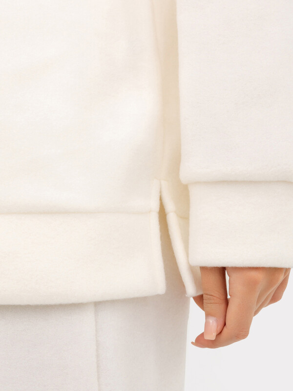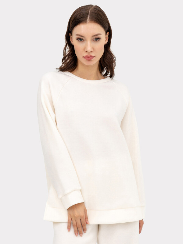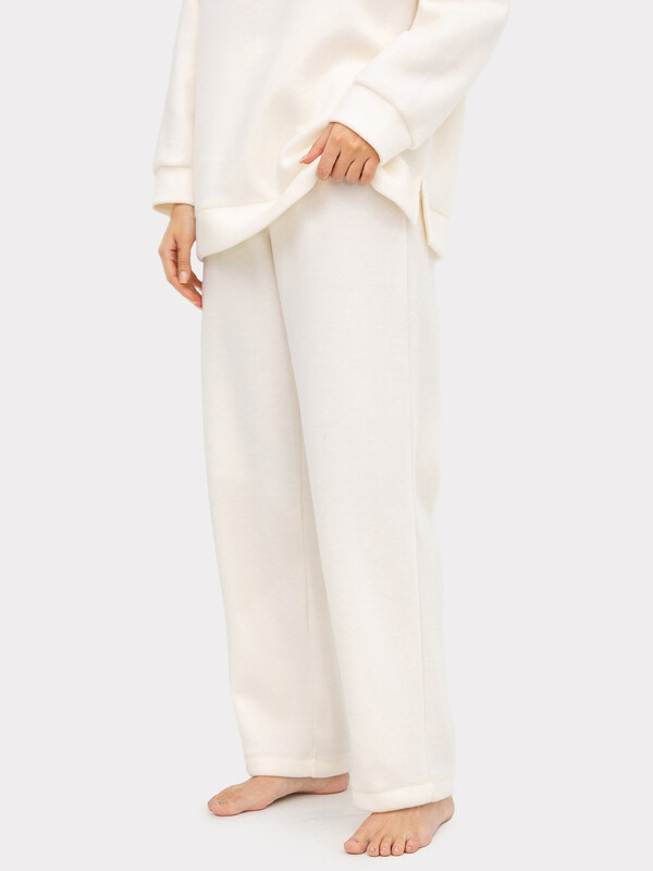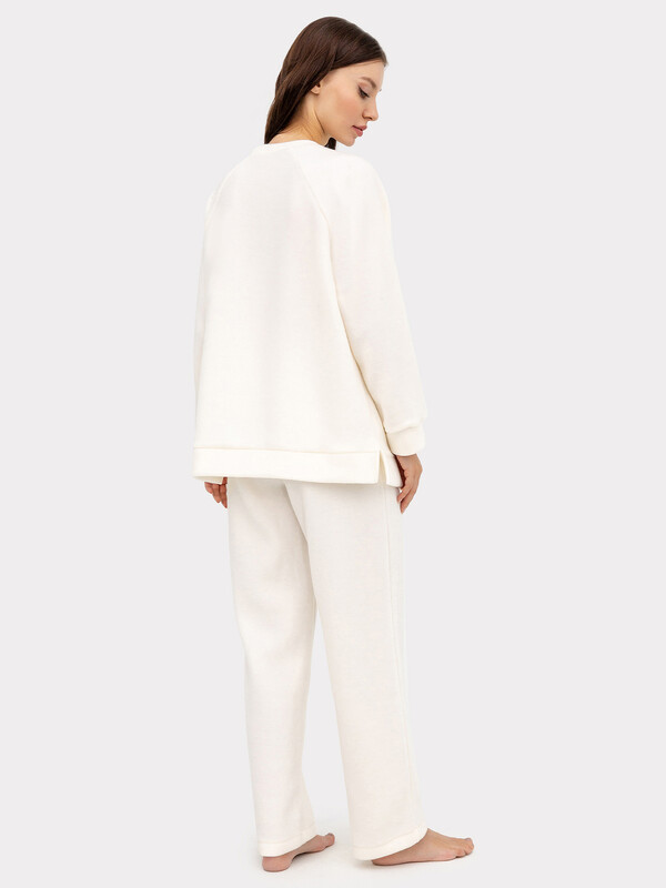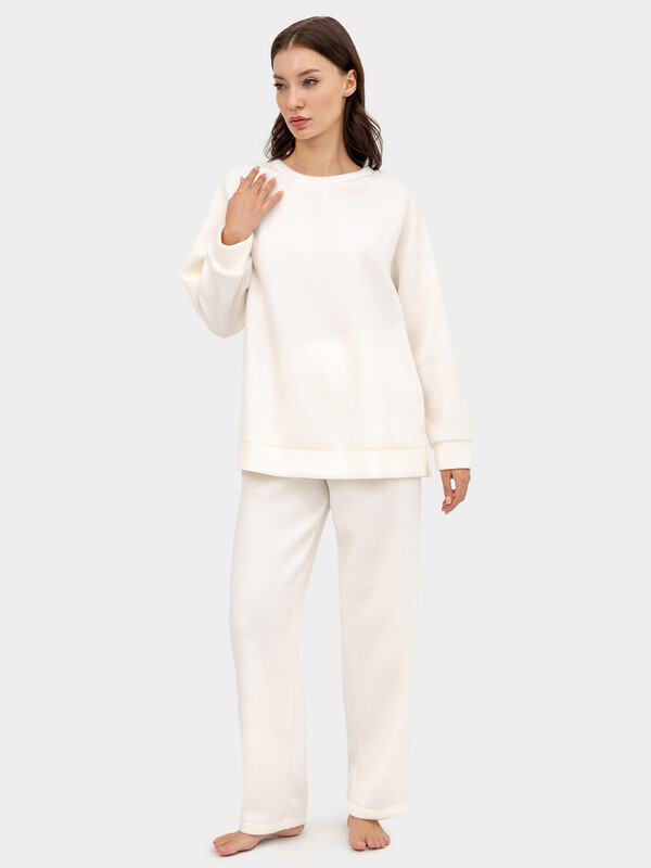 Комплект женский из джемпера и брюк. Джемпер женский свободного силуэта. Горловина круглой формы с обтачкой из основного полотна. Рукава реглан, с отрезной манжетой по низу. В боковых швах обработаны разрезы. По низу джемпера отрезной пояс. Брюки с посадкой на талии, прямого силуэта. Пояс цельнокроеный с резиной внутри. Низ брюк обработан швом в подгибку. 69% полиэстер; 31% вискоза Вид застежки: без застежки Декоративные элементы: без элементов Модель брюк: прямые Назначение: домашняя одежда Покрой: прямой Предмет: Костюмы Тип карманов: без карманов Тип рукава: длинные Утеплитель: без утепления Уход за вещами: деликатная стирка при 30 градусах длина брючин по внутр. шву, см: 73,6 длина изделия по боковому шву - низ, см: 103,2 длина изделия по спинке, см.: 67,5 фактура материала: флис ширина брючин - низ, см: 22,2 Комментарии к товару