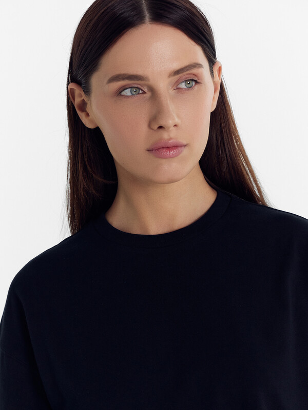 Горловина круглой формы, обтачка горловины из рибаны 1*1. Шов горловины спинки закрыт бейкой из кулирки 100хл.