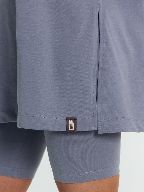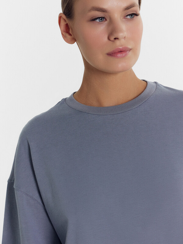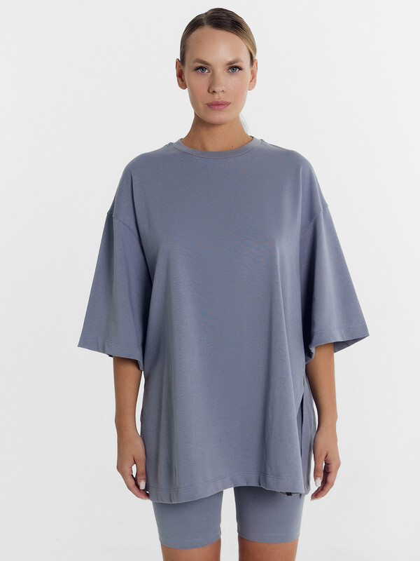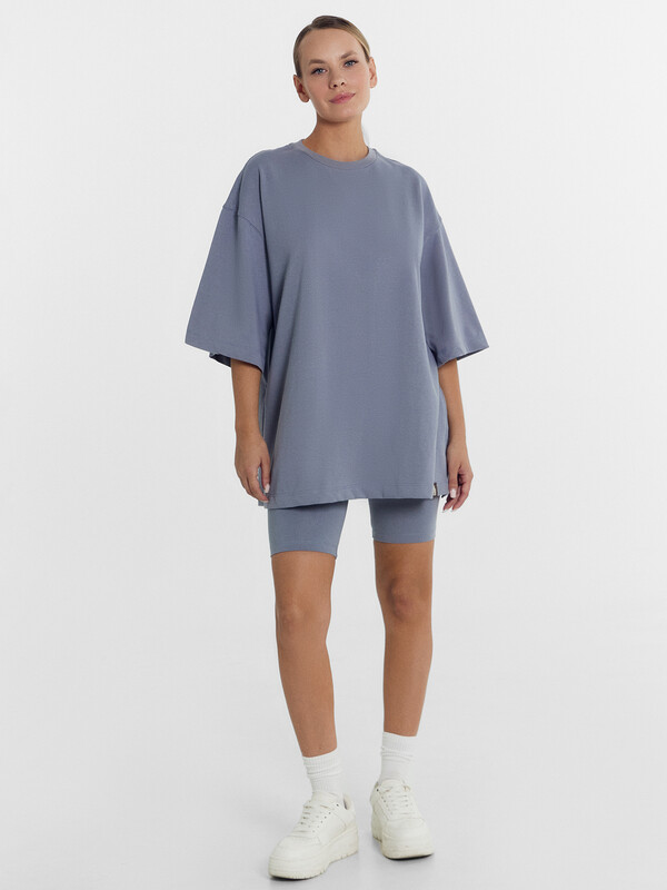 Джемпер свободного силуэта из трикотажного полотна кулирка 100хл. Горловина круглой формы, обтачка горловины из рибаны 1*1. Шов горловины спинки закрыт бейкой из кулирки 100хл. Плечо спущено, пройма углублена, рукав втачной удлиненный. По плечу и пройме проложены отделочные строчки. Джемпер удлинен, с разрезами в боковых швах. Шорты прилегающего силуэта из трикотажного полотна кулирка хл/эл. Пояс отрезной, широкий, по сгибу с эластичной тесьмой. Шорты без бокового шва. Длина шорт выше колена. 98% хлопок; 2% эластан Комментарии к товару