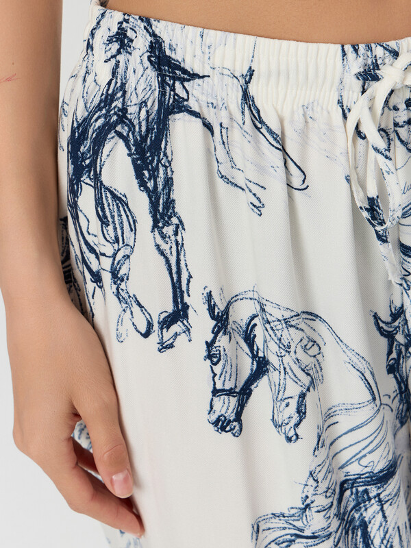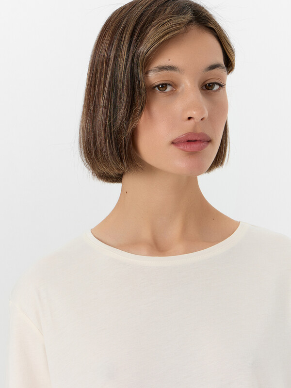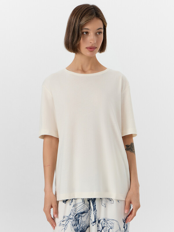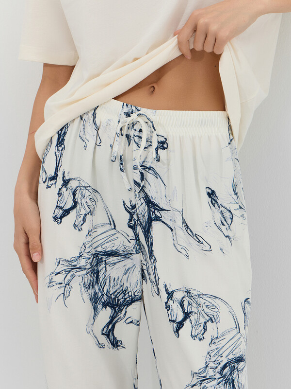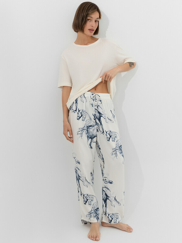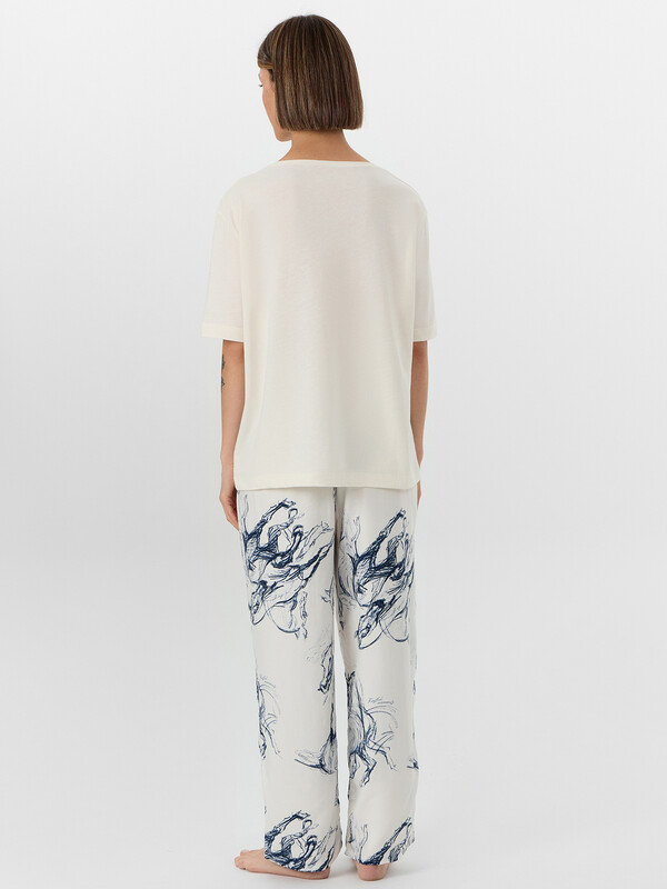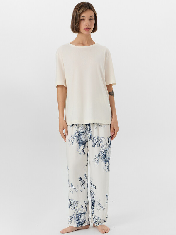 Верхняя часть выполнена из комбинации модала и хлопка — материалов, известных своей шелковистой мягкостью и прочностью. Бриджи выполнены из вискозы, которая обеспечивает идеальную воздухопроницаемость и нежность прикосновения к коже. Такой состав гипоаллергенен, отлично сохраняет цвет и форму после стирок, делая пижаму идеальной для ежедневного использования. Комплект станет любимым вариантом для спокойного сна, уютных вечеров с книгой или неспешных утренних ритуалов.