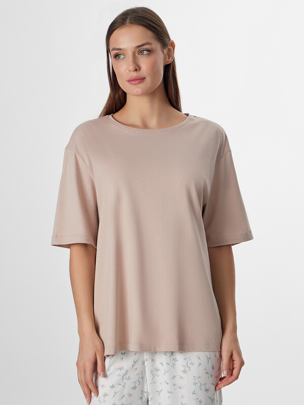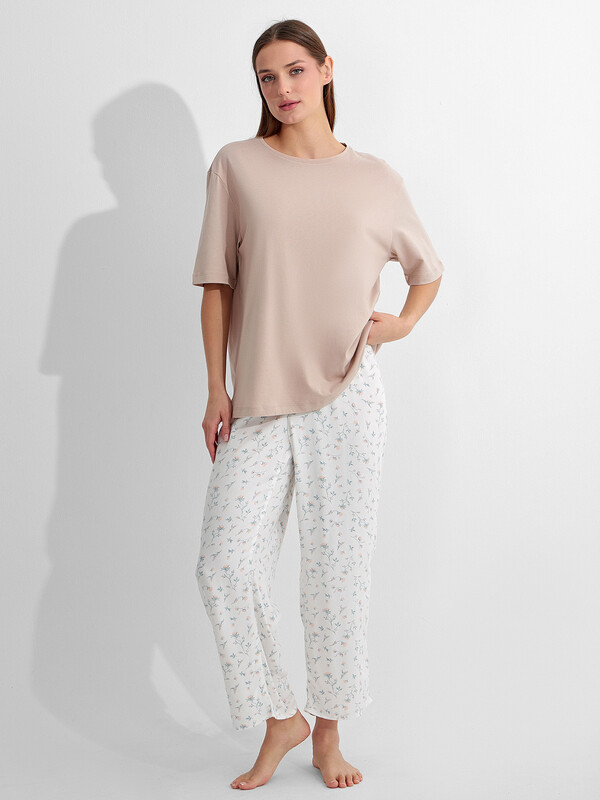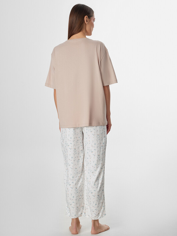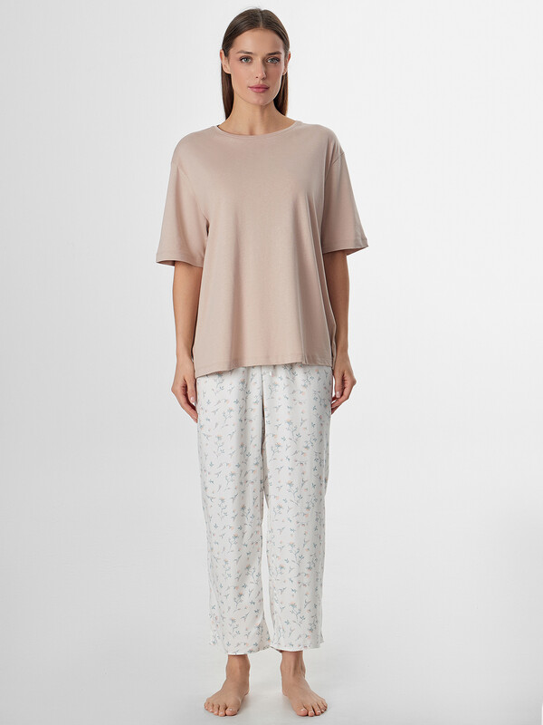 Женский домашний комплект с нежным узором — это воплощение уюта и бережной заботы о комфорте. Пижама состоит из футболки и бриджей прямого кроя, которые дарят полную свободу движений и сохраняют элегантность даже в домашней обстановке.