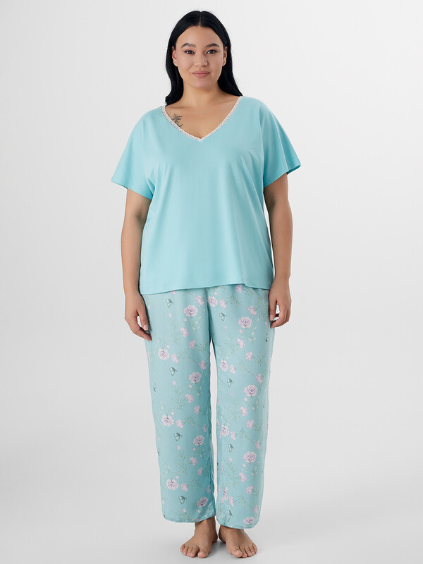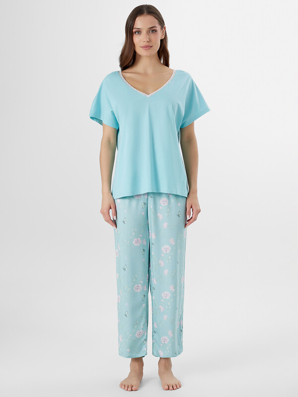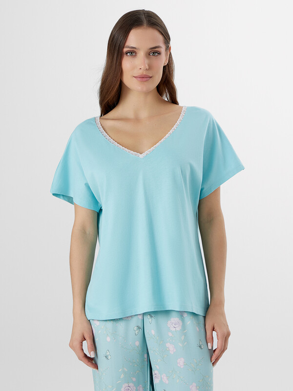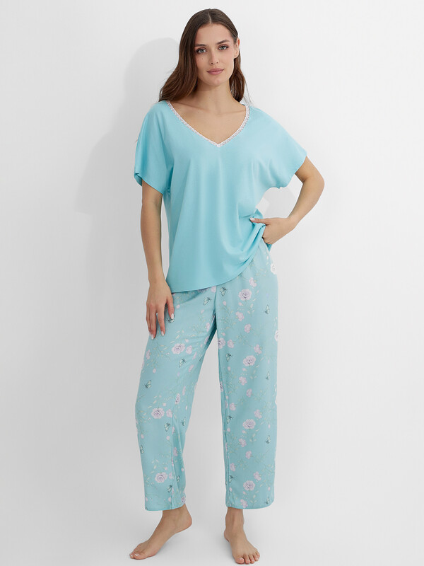 Производитель: Mark Formelle Комплект женский состоит из футболки и бридж. Футболка свободного силуэта.  Горловина V-образная с отделькой из кружева, по спинке обтачка из основного полотна. Рукав короткий. Нижний срез футболки и рукавов обработан швом в подгибку.