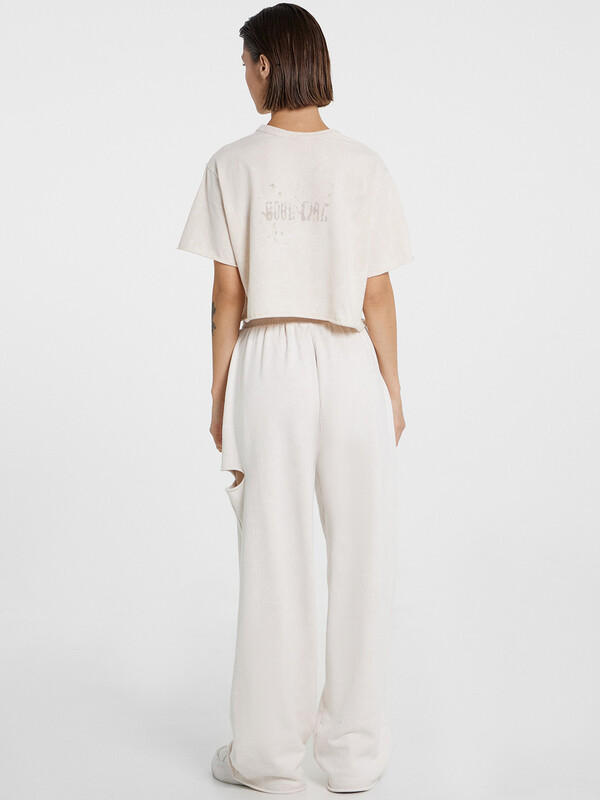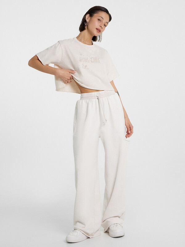 Повседневный женский комплект состоит из модной укороченной футболки и брюк. Футболка из мягкого трикотажного полотна - кулирки. Горловина круглой формы окантована эластичной рибаной. Плечи слегка спущены, пройма углублена. Рукава футболки короткие. Брюки из трикотажного футера без подчеса. Пояс отрезной, с вшитой эластичной тесьмой, позволяющей регулировать посадку. Длина брюк - полная, низ брюк имеет сырой срез. Выбранные материалы: кулирка и футер - обеспечивают высокий уровень комфорта и мягкость при носке. Свободный крой комплекта подчеркивает современную эстетику casual стиля, делая его идеальным выбором для прогулок, занятий спортом или создания городских образов. Широкий размерный ряд. Рекомендуем!