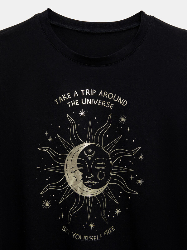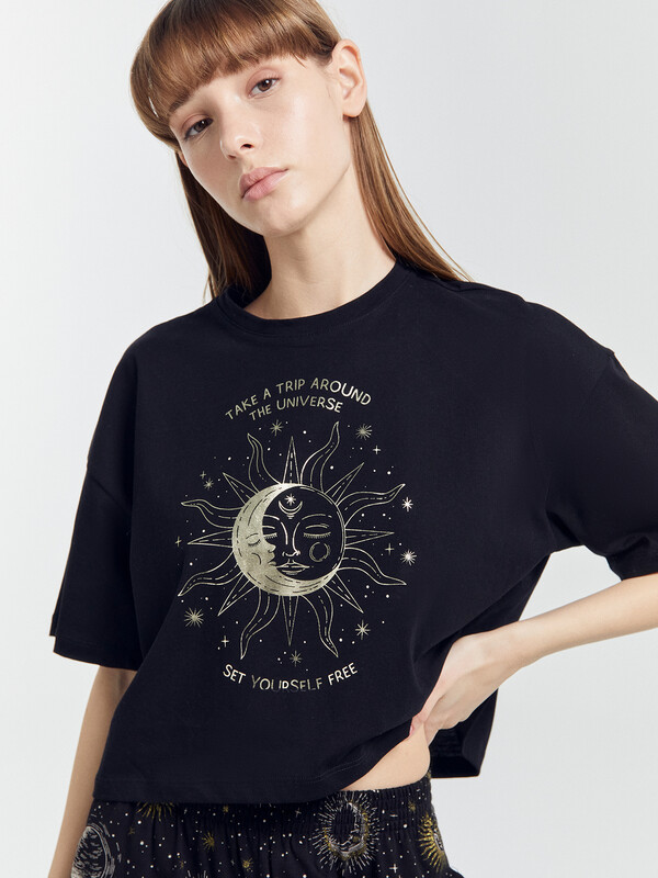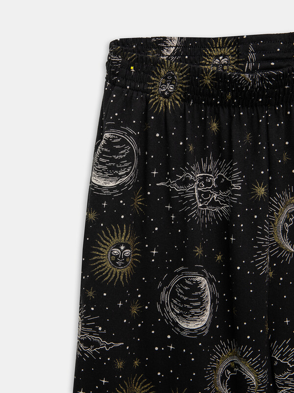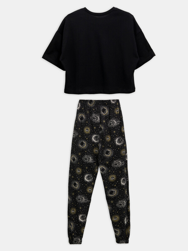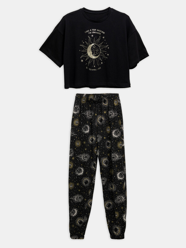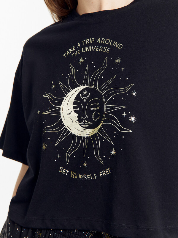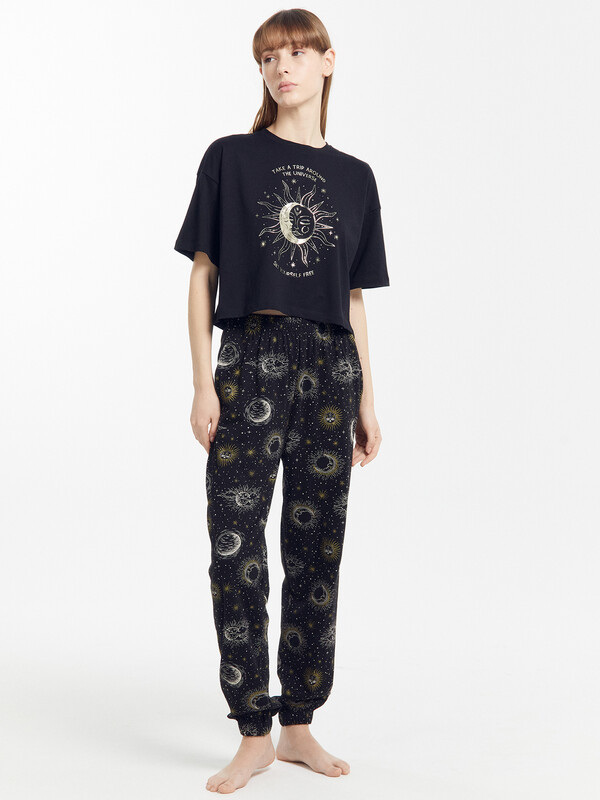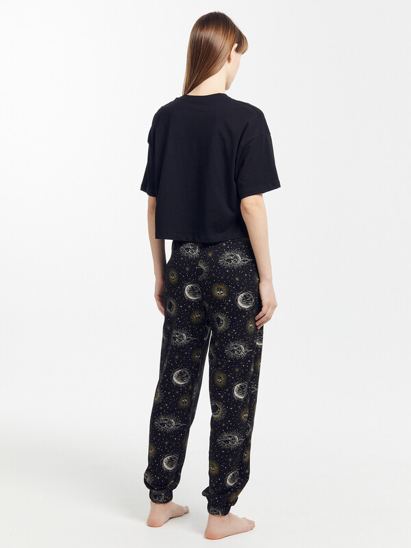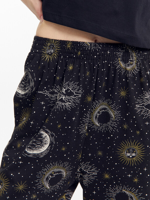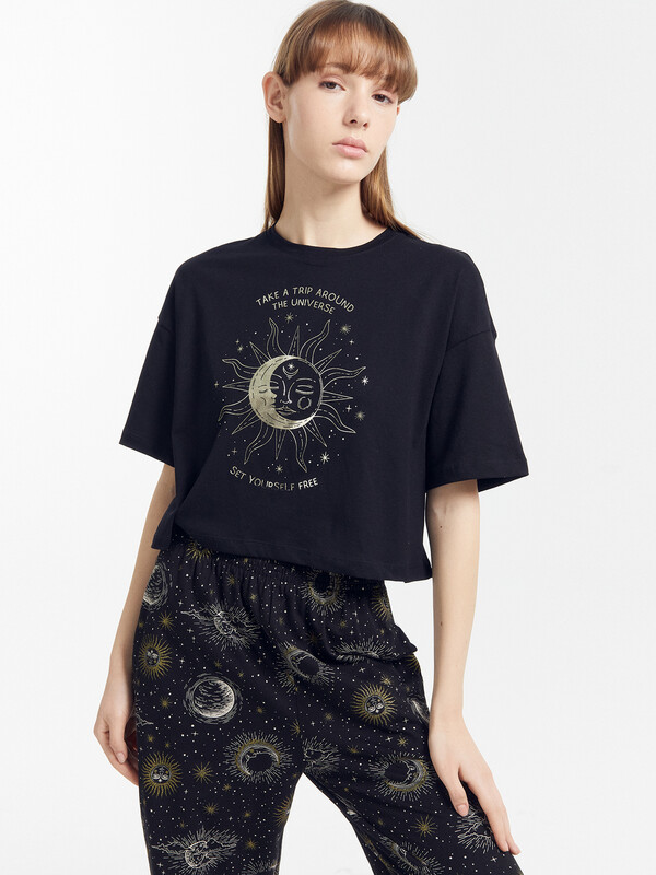 Пижамный комплект из хлопковой трикотажной кулирки. Футболка укороченная, свободного силуэта, с круглой горловиной и короткими рукавами. Спущенная линия плеча и углубленная пройма дарят особый комфорт. Брюки объемные, с высокой посадкой на талии, с резиной в поясе и боковыми карманами. Для особого уюта вашего сна!