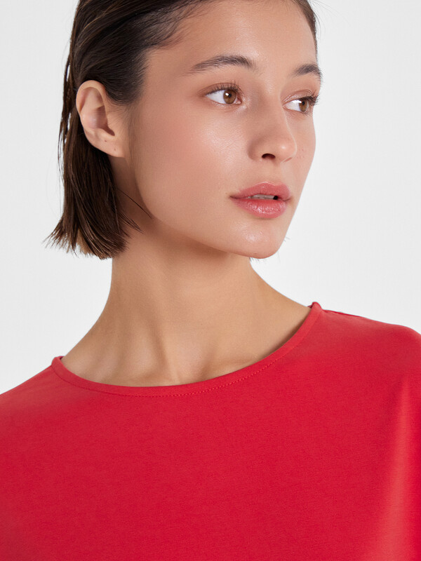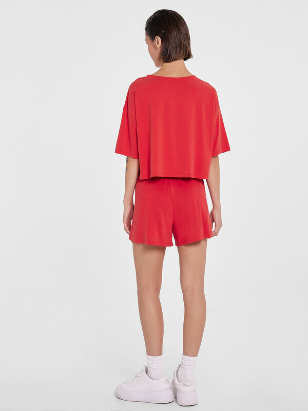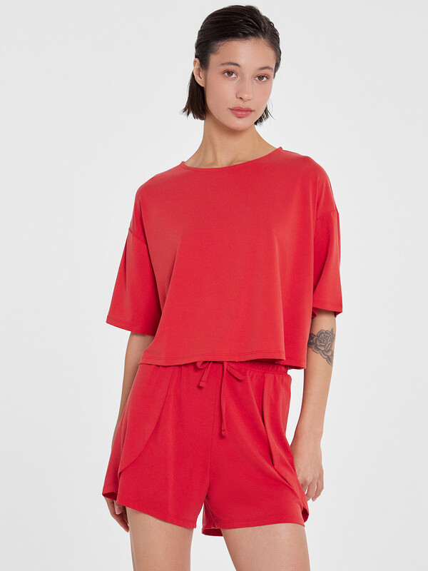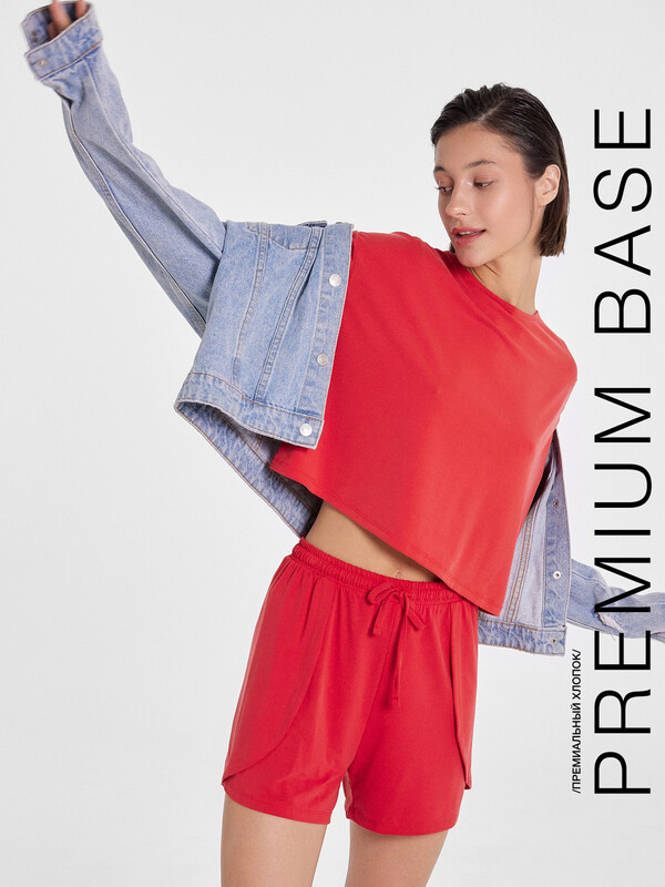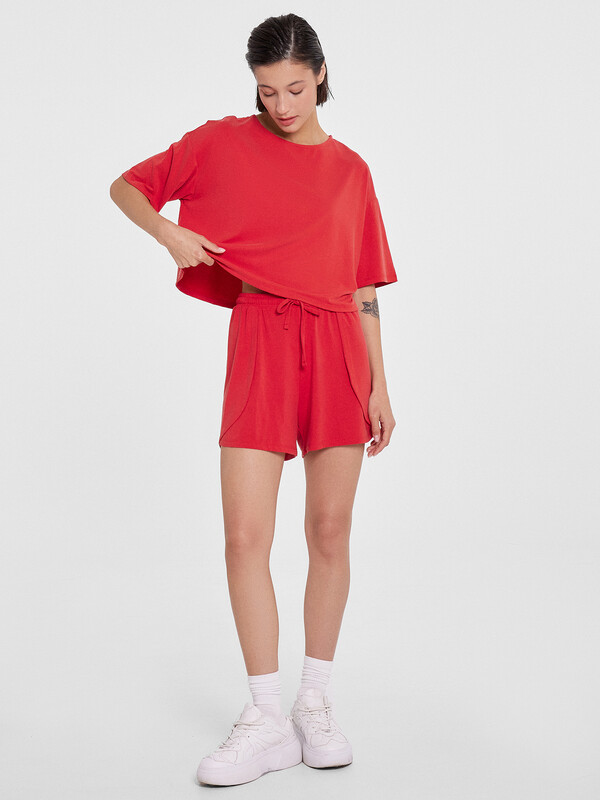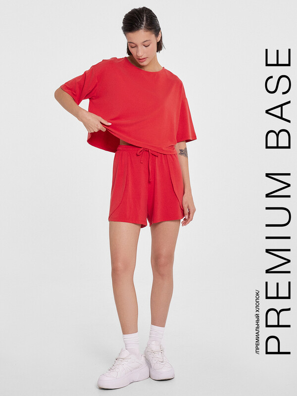 Футболка женская свободного силуэта из трикотажного полотна кулирка. Горловина круглой формы, окантована бейкой в чистый край из основного полотна. Плечо спущено, пройма углублена, рукав втачной короткий. Футболка уокорочена. Шорты свободного силуэта из трикотажного полотна кулирка. Пояс отрезнойс эластичной тесьмой внутри, по поясу проложены отделочные строчки. В поясе пробиты петли и вставлен шнур из основного полотна. Задняя деталь идет внахлест на переднюю деталь. Низ шорт фигурный. Шорты короткие. 68% модал; 28% полиэстер; 4% эластан Комментарии к товару