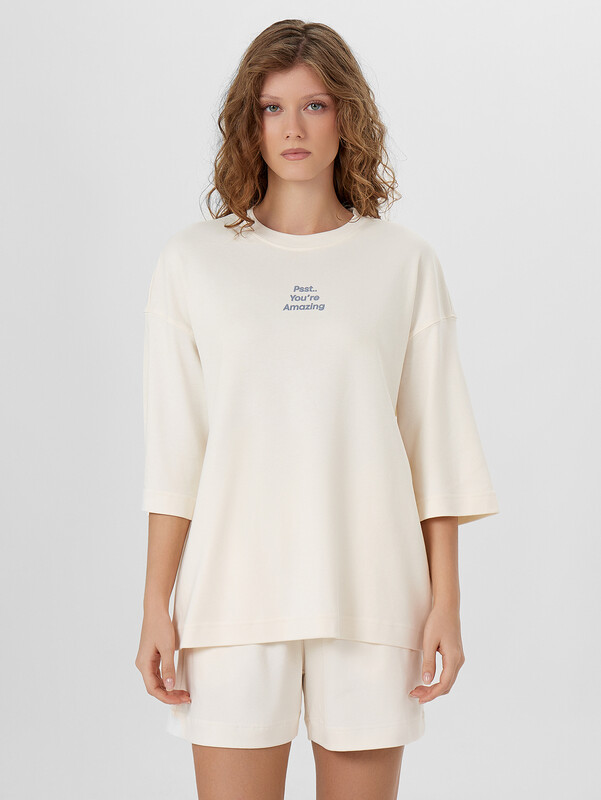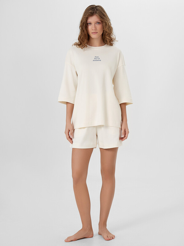 Этот комплект, состоящий из свободной футболки и шорт, идеален для отдыха и расслабления. Мягкий хлопок, из которого выполнена пижама, обеспечивает комфорт и нежность прикосновения к коже. Футболка с круглой горловиной и спущенной линией плеча не ограничивает движения, а шорты с высокой посадкой на талии и эластичным поясом дарят чувство свободы. Функциональные карманы «хулиганы» и аккуратная обработка швов подчеркивают продуманность дизайна. Если вы ищете женскую пижаму с шортами из натурального материала, этот набор станет прекрасным выбором для ежедневного использования. В нашем интернет-магазине вы найдете модели, которые сочетают качество и стиль. Надпись на футболке добавит уверенности, а нейтральный оттенок легко дополнит ваш домашний гардероб. Нежность, комфорт и вдохновение — в каждой детали! 100% хлопок Комментарии к товару