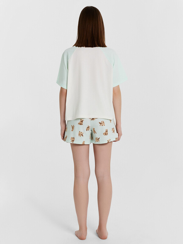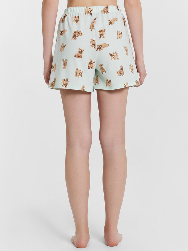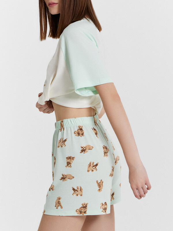Шорты прямого силуэта, короткие. Пояс цельнокроеный, с втачной эластичной тесьмой 30RV. Низ шорт обработан швом в подгибку.