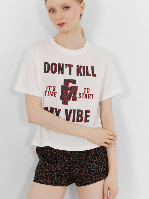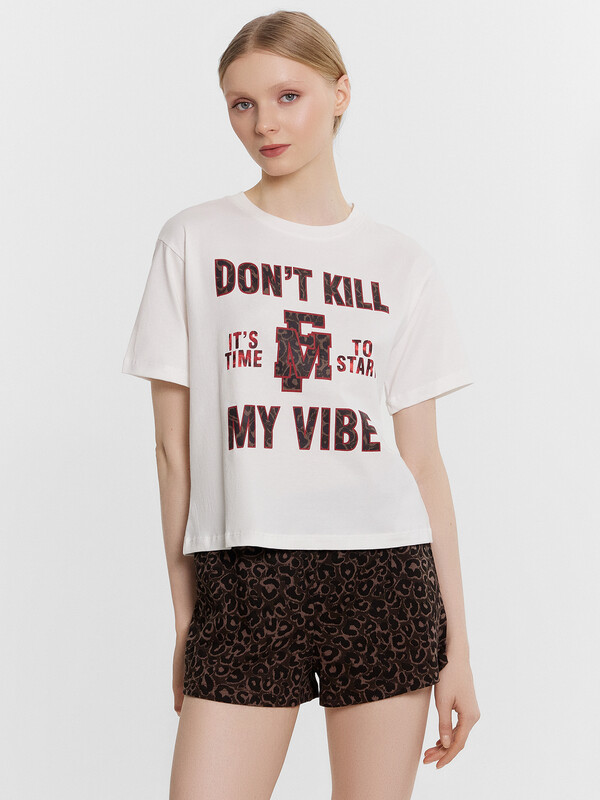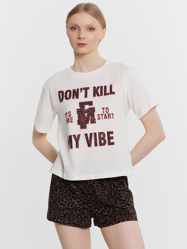 Комплект женский состоит из футболки и шорт. Футболка свободного силуэта. Горловина круглой формы, обтачка из основного полотна. Рукава втачные свободные, линия плеча слегка спущена. Низ рукавов и футболки в подгибку. Шорты свободного силуэта, короткие. Пояс цельнокроеный, с втаченой эластичной тесьмой. Низ шорт обработан швом в подгибку. 99% хлопок; 1% эластан Комментарии к товару