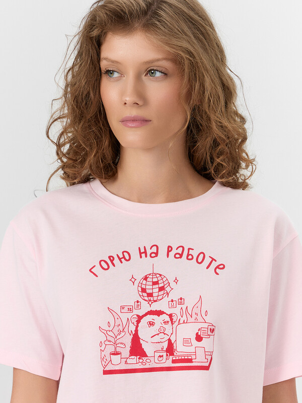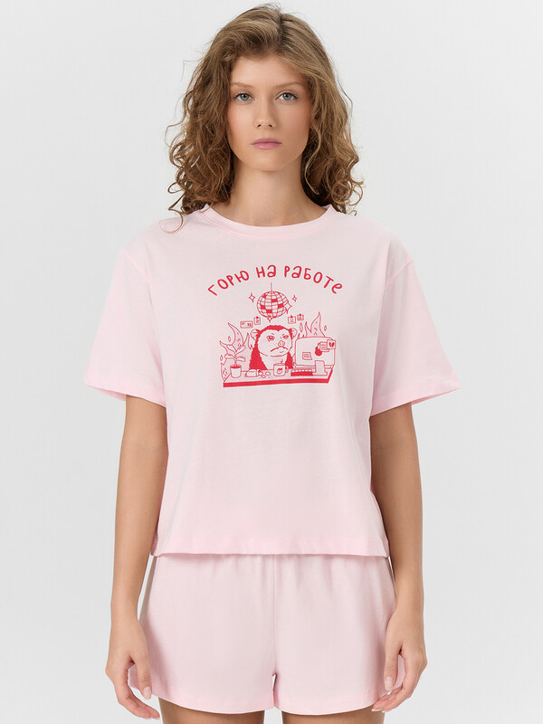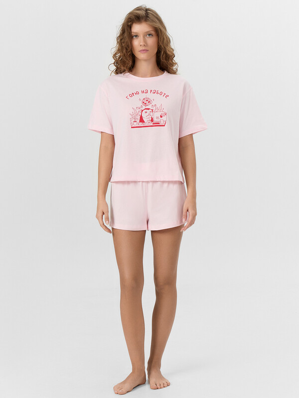 Комплект женский состоит из футболки и шорт. Футболка свободного силуэта. Горловина круглой формы, обтачка из основного полотна. Рукава втачные свободные, линия плеча слегка спущена. Низ рукавов и футболки в подгибку. Шорты свободного силуэта, короткие. Пояс цельнокроеный, с втаченой эластичной тесьмой. Низ шорт обработан швом в подгибку. 100% хлопок Комментарии к товару