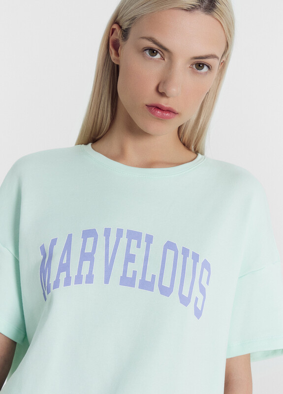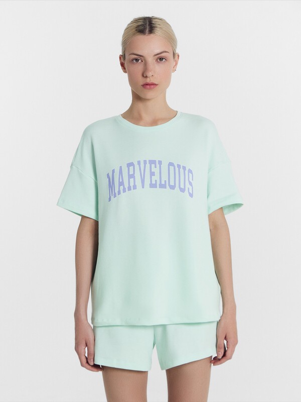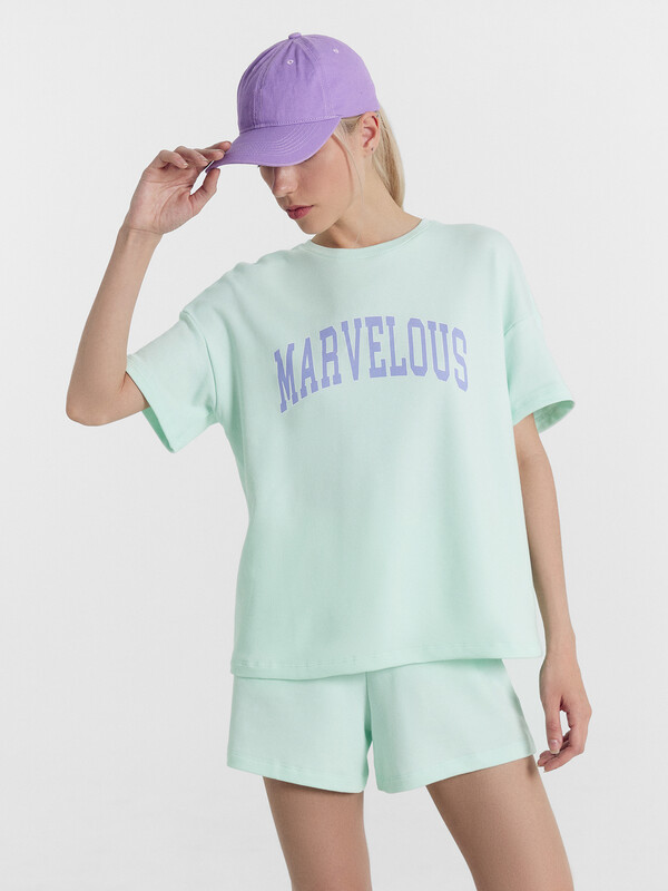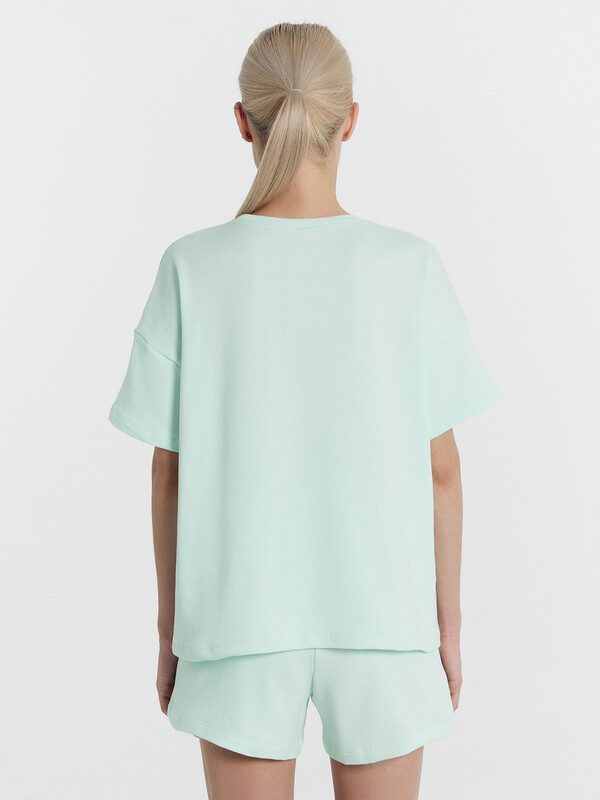 Комплект женский состоит из футболки и шорт. Футболка свободного силуэта. Горловина круглой формы, обтачка из основного полотна. Рукава втачные свободные, линия плеча слегка спущена. Низ рукавов и футболки в подгибку.