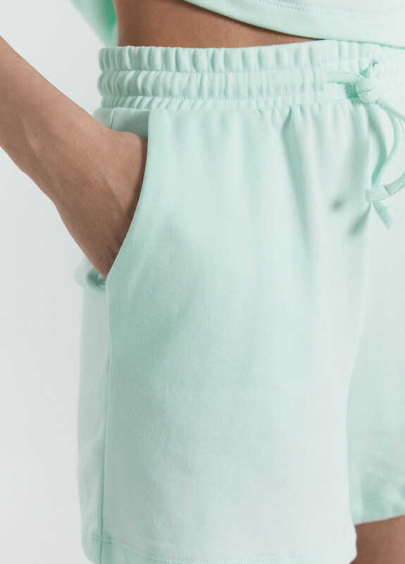 Шорты прямого силуэта, короткие. Пояс отрезной, с втаченной эластичной тесьмой. По центу пояса пробиты петли, протянут шнур из основного полотна. На передних деталях карманы «хулиганы». Низ шорт обработан швом вподгибку.