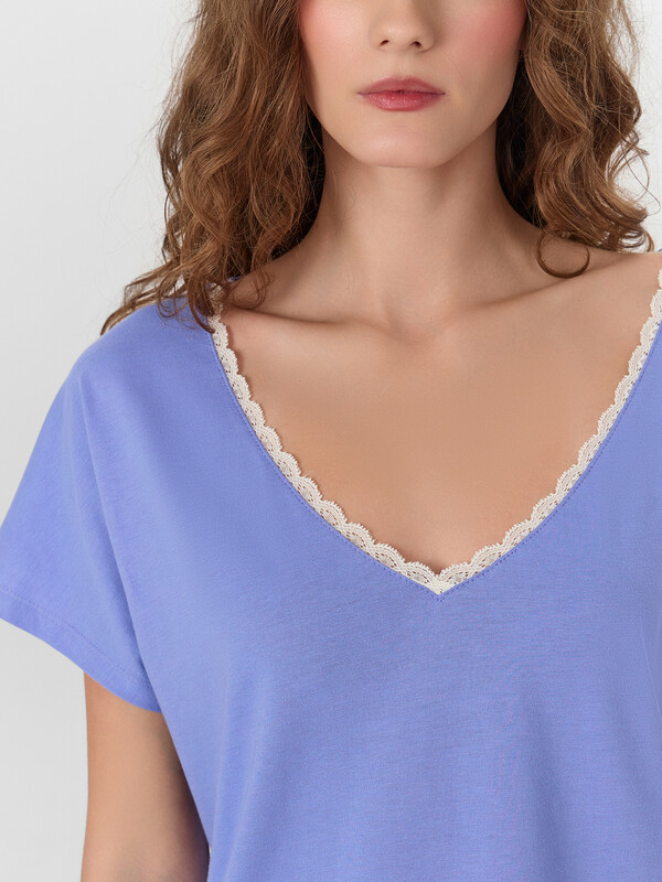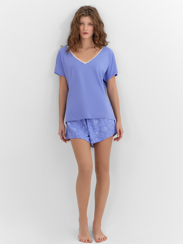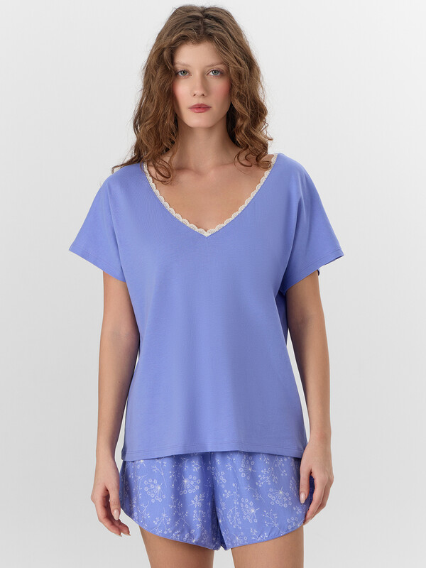 Производитель: Mark Formelle Комплект женский состоит из футболки и шорт. Футболка свободного силуэта. Горловина V-образная с отделкой из кружева, по спинке обтачка из основного полотна. Рукав короткий. Нижний срез футболки и рукавов обработан швом вподгибку.