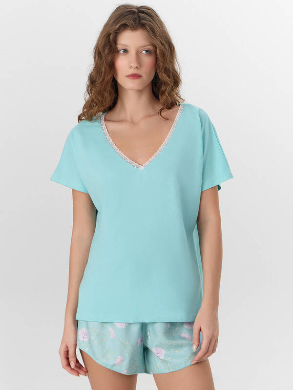 Производитель: Mark Formelle Комплект женский состоит из футболки и шорт. Футболка свободного силуэта. Горловина V-образная с отделкой из кружева, по спинке обтачка из основного полотна. Рукав короткий. Нижний срез футболки и рукавов обработан швом вподгибку.