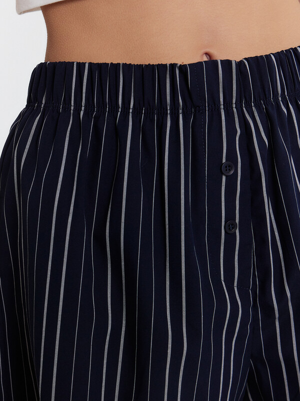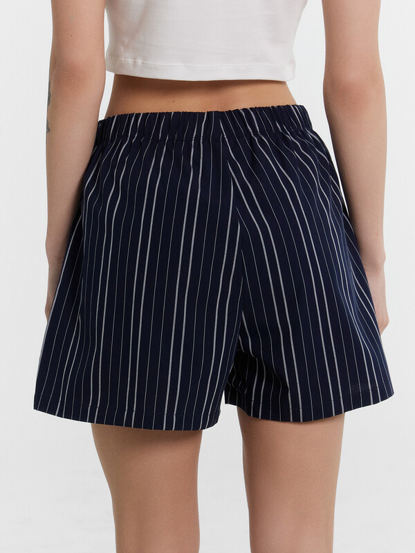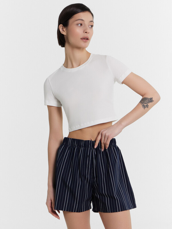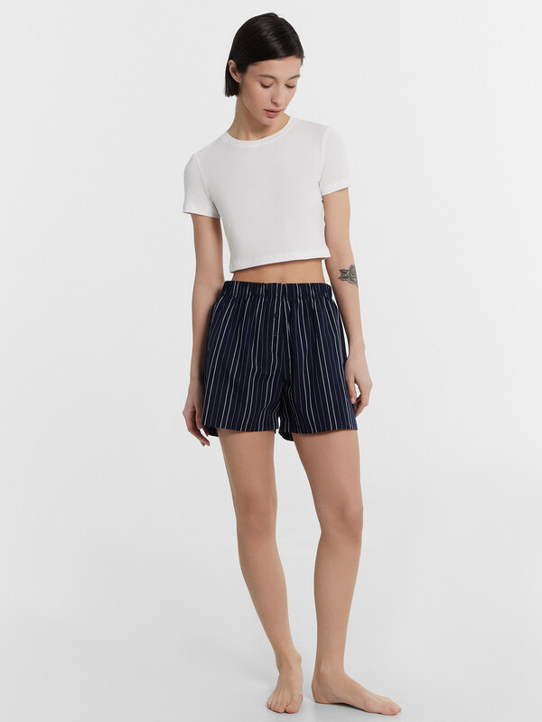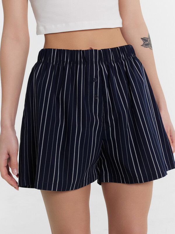 Шорты свободного силуэта. Пояс цельнокроеный, с эластичной тесьмой внутри 40RV. На передней половинке обработана планка с имитацией застежки и с двумя пуговицами d=10 мм . Нижние срезы обработаны швом в подгибку. декор по заданию верх:95% хлопок, 5% эластан; низ:100% хлопок Комментарии к товару