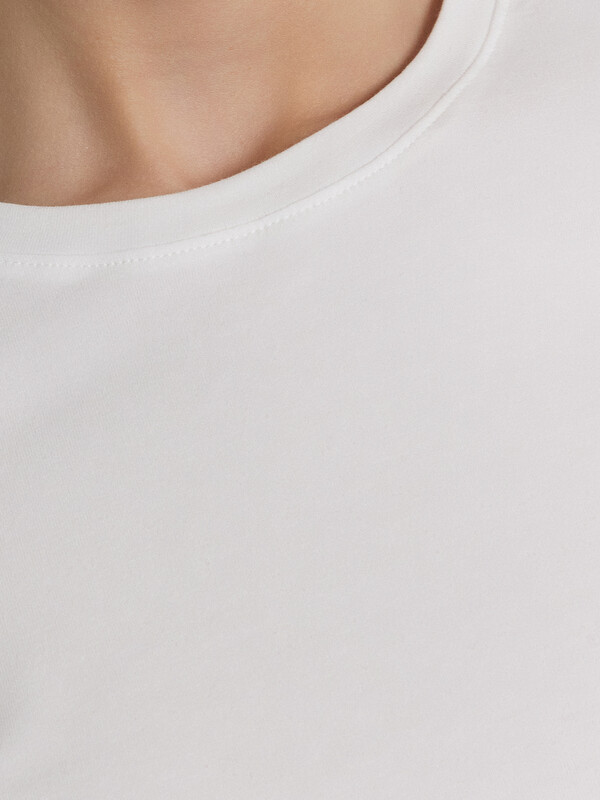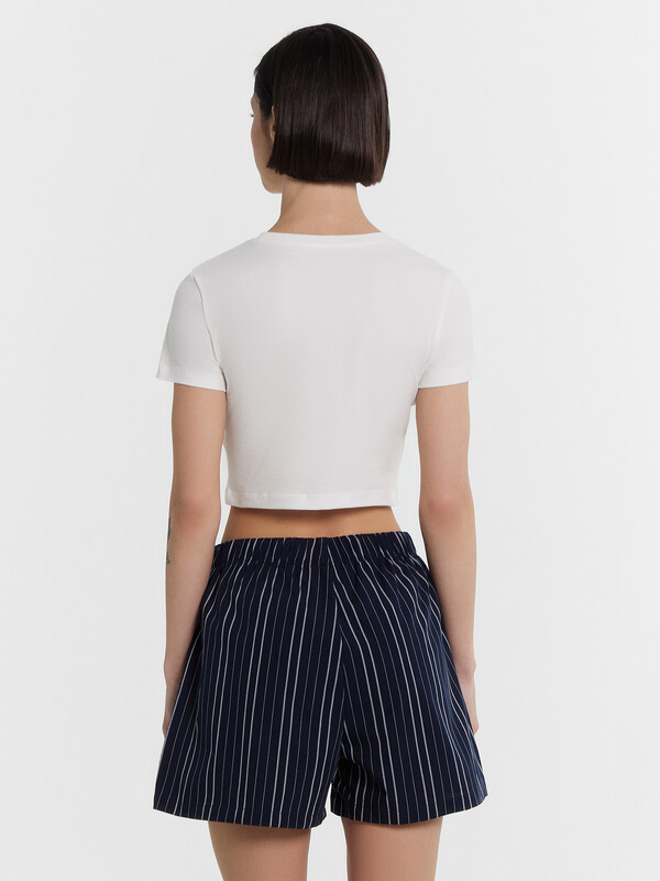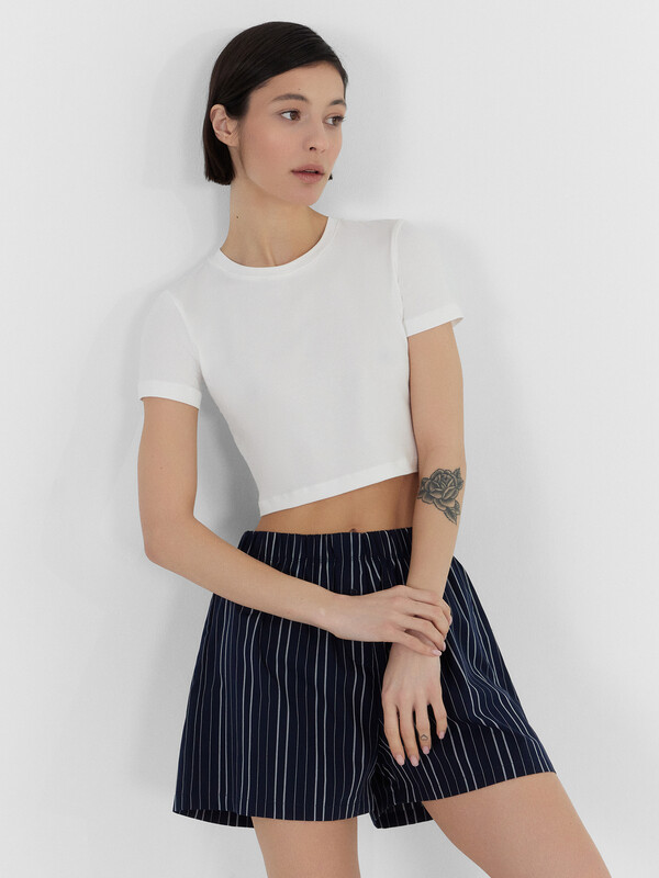 Футболка женская прилегающего силуэта. Горловина круглой формы, горловина окантована бейкой из основного полотна. Рукав втачной короткий. Футболка укороченная.