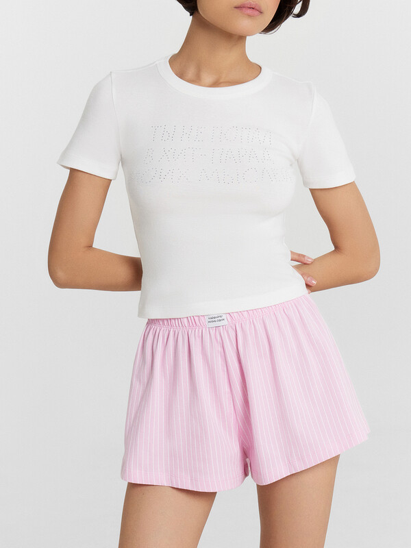 Этот домашний комплект — яркое и удобное решение для отдыха и повседневной носки дома. Футболка прилегающего силуэта, украшенная надписью из страз "Ты не попал в хит-парад моих мыслей", добавляет образу оригинальности и игривого акцента. Круглая горловина и короткие рукава подчеркивают лаконичный дизайн, а обработка нижнего края и рукавов швом вподгибку обеспечивает аккуратность и долговечность изделия. Шорты свободного силуэта с эластичным поясом гарантируют комфортную посадку и свободу движений. Укороченная длина и обработанные нижние срезы делают шорты практичными и стильными, идеально подходящими для домашнего гардероба. Комплект выполнен из натурального хлопка, который обеспечивает мягкость, воздухопроницаемость и приятные ощущения на коже. Он идеально подходит для создания комфортного и стильного образа дома. 100% хлопок Комментарии к товару
