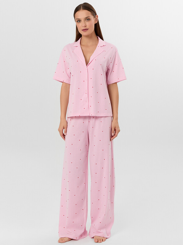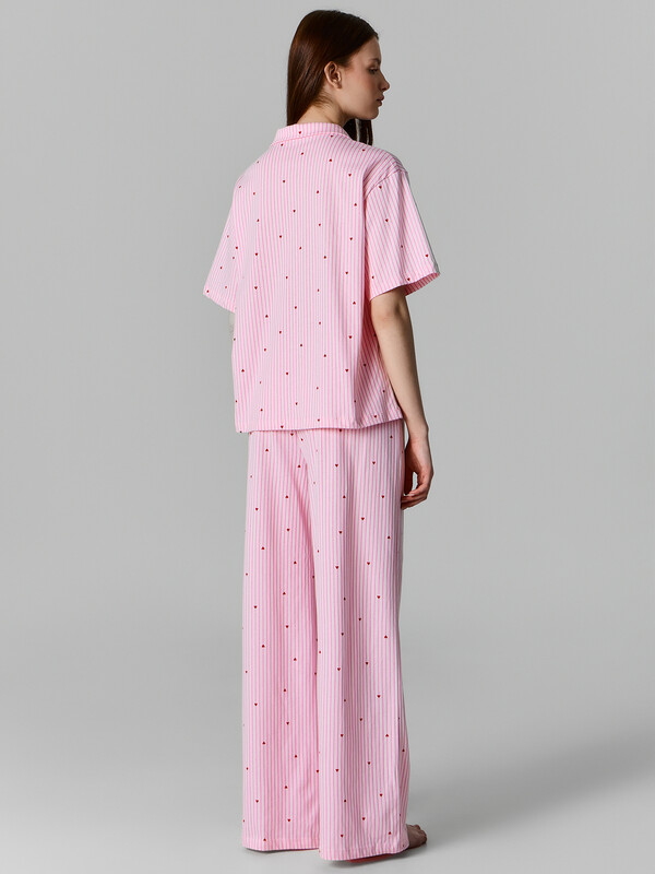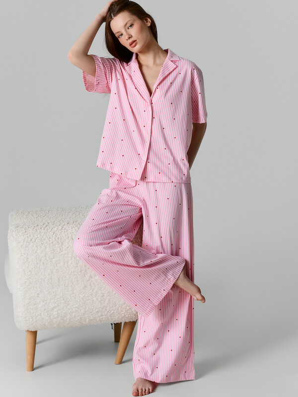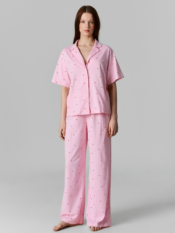 Женский домашний комплект, состоящий из рубашки и брюк, — это идеальное решение для комфортного отдыха и уютных домашних вечеров. Модель выполнена из натурального хлопка, который отличается мягкостью, воздухопроницаемостью и гипоаллергенными свойствами, обеспечивая приятные ощущения на коже и свободу движений. Рубашка свободного силуэта с отложным воротником выглядит аккуратно и стильно, а короткий рукав с немного спущенной линией плеча подчеркивает расслабленный характер изделия. Обработка рукава и низа швом в подгибку делает модель аккуратной и долговечной. Центральная застёжка на пуговицы с петлями добавляет удобства и классического акцента. Брюки свободного силуэта с посадкой на талии обеспечивают комфорт и не стесняют движений. Эластичный пояс мягко фиксируется, а декоративная бейка из основного полотна, протянутая через пробитые петли, добавляет стильный элемент. Низ брюк также обработан швом в подгибку, что сохраняет форму и аккуратность. Комплект идеально подходит для сна, отдыха или домашних дел, сочетая в себе практичность, уют и эстетичный внешний вид.