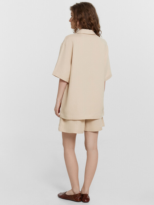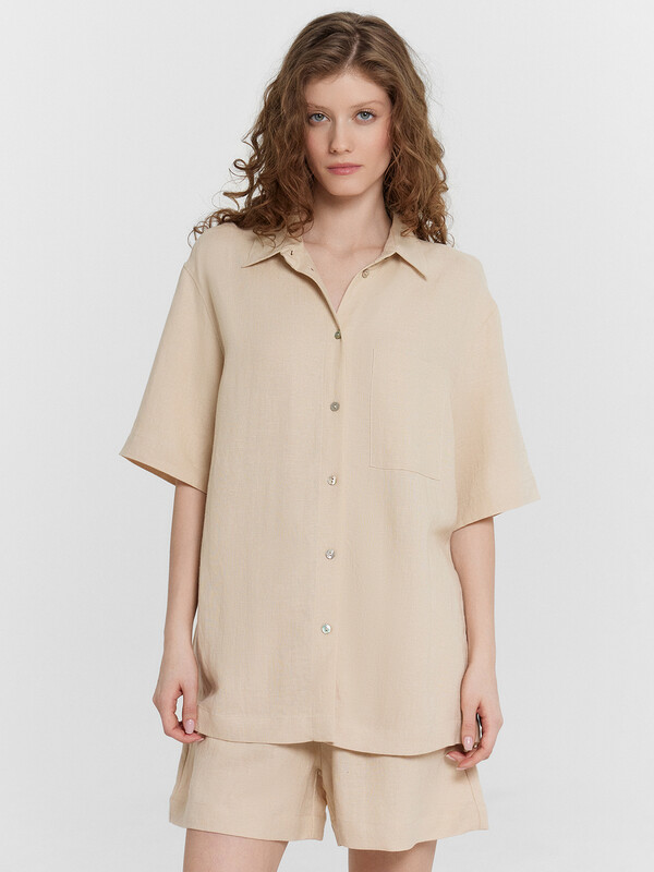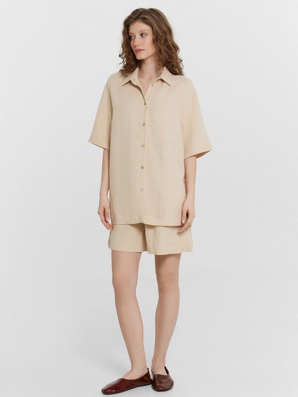 Этот женский комплект — идеальное сочетание комфорта и универсального дизайна! В комплект входят рубашка и шорты, выполненные из сочетания натурального льна и вискозы, что делает ткань мягкой, дышащей и приятной для кожи. Рубашка с центральной застёжкой на пуговицы имеет круглый вырез горловины, дополненный рубашечным воротником, что добавляет модели стильный и аккуратный вид. Накладной карман на груди — практичный акцент, а спущенная линия плеча и углубленная пройма обеспечивают удобную посадку и свободу движений. Короткие рукава и прямой низ, обработанный швом вподгибку, делают рубашку универсальным элементом для любого образа. Шорты свободного силуэта длиной выше колен прекрасно дополняют комплект. Эластичный пояс на кулиске позволяет легко регулировать посадку, обеспечивая комфорт на протяжении всего дня. Боковые карманы добавляют практичности, а нижний срез, обработанный швом вподгибку, подчеркивает качественное исполнение. Такой комплект станет отличным выбором для повседневной носки, прогулок или путешествий, даря легкость и стиль в каждом движении. Рекомендуем!