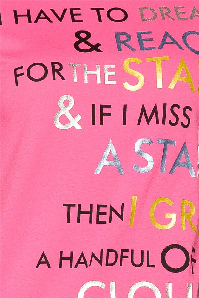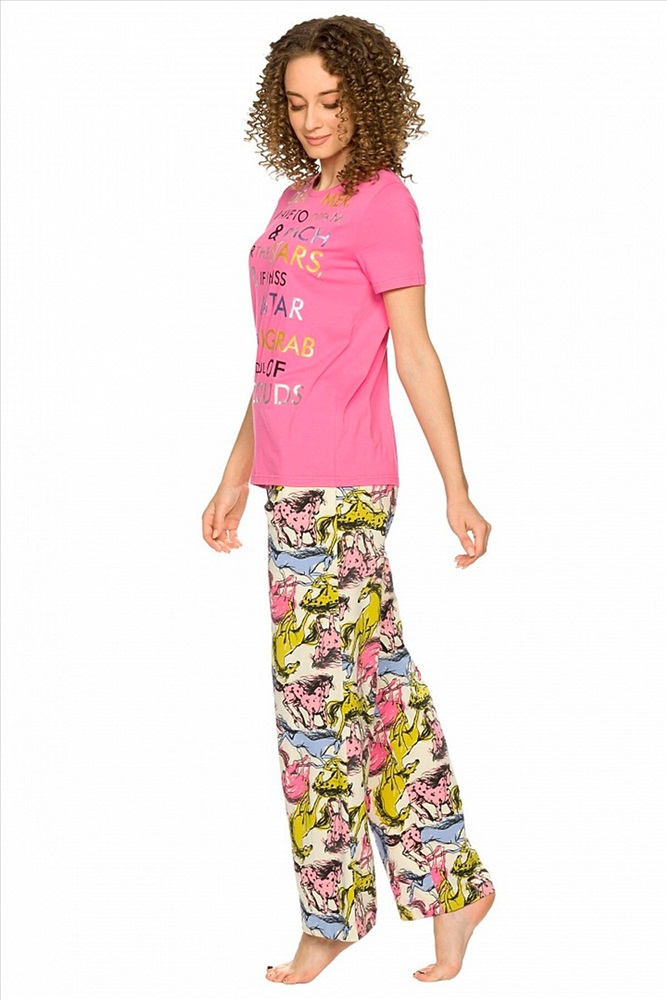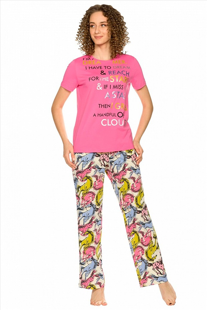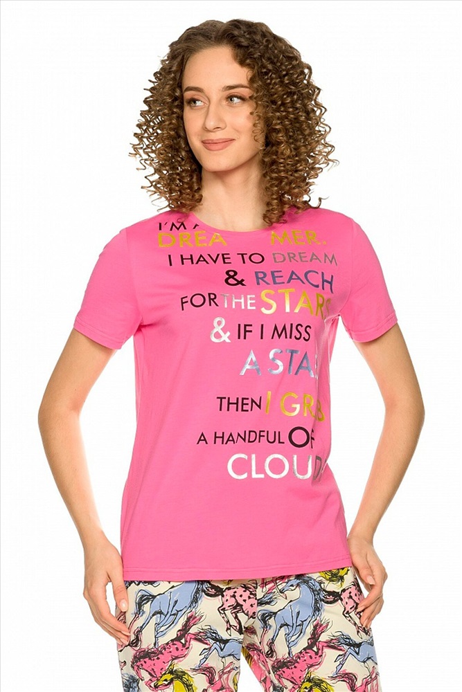 Комплект женски: футболка и брюки. Футболка прямая, небольшого объема. Шрифтовой принт с разноцветным металликом. Перевод Я мечтатель, я должен мечтать и тянуться к звездам. А если я не могу поймать звезду, я ловлю пригоршню облаков . Брюки прямые, свободные, с высокой линией талии. Мягкий стойкий all over принт динамичные и сказочные лошади.