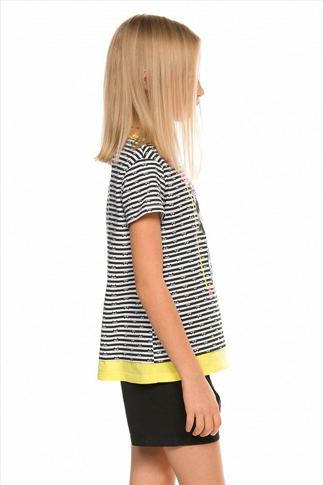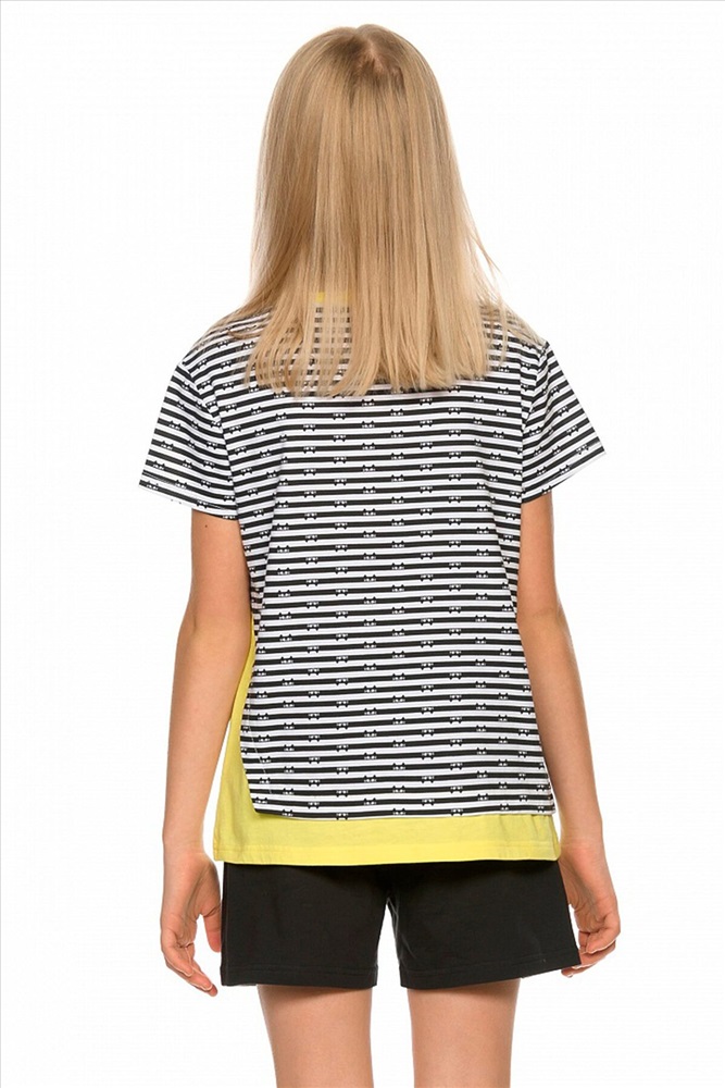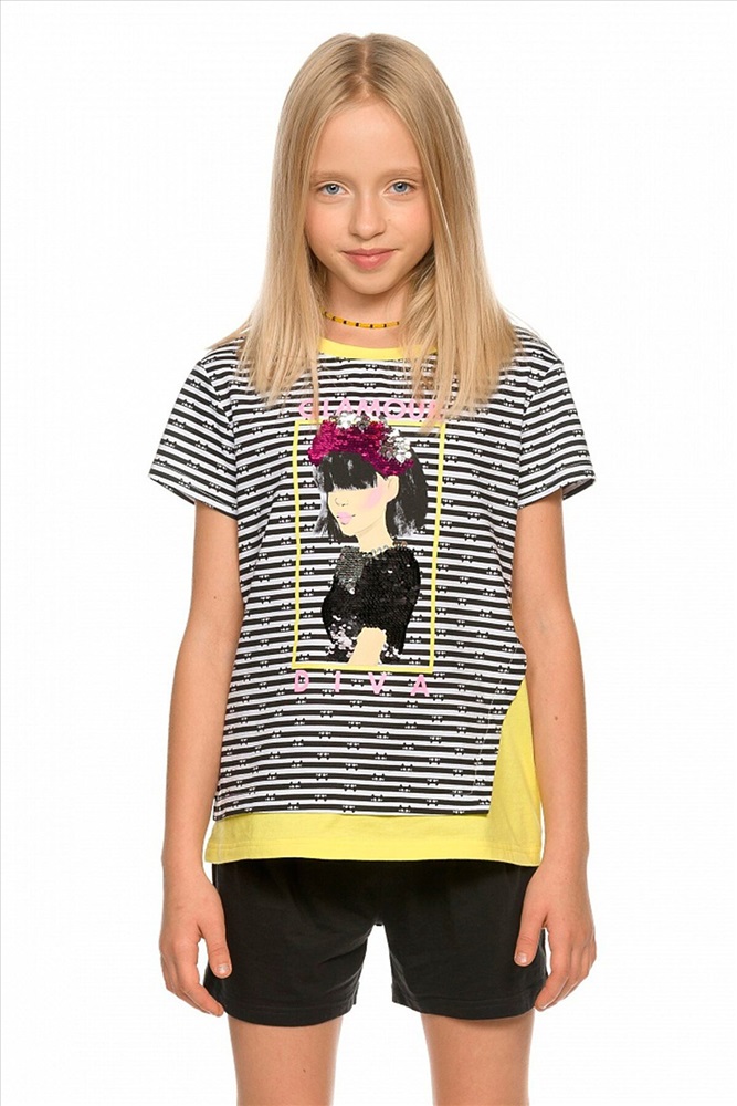 ID товара: 291732 Состав: Верх- Хлопок 100%; Низ- Хлопок 100% Сезон: Весна/Лето Длина: Короткая Фасон: Прямой Рукав: Короткий Вид застежки: Нет Крой брючин: Прямой Рисунок: Полоска Тип карманов: Без карманов Декоративные элементы: Пайетки Основная ткань: Хлопок Стиль: Повседневный Страна бренда: Россия Страна производства: Россия Новая футболка умеренного объема с мягкой линией плеча. Имитация многослойности одна футболка надетая поверх другой. Верхняя полосатая, с ассиметрично срезанным боковым швом и горловиной из рибаны в цвет нижней. Нижняя желтая. Принт с замаскированными в полоски мордочками кота. По центру вышивка из переворачивающихся пайеток и неоНовый принт с глиттером, перевод Гламурная дива. Шорты умеренного объёма с защипами у пояса. Регулировка объема внутренним шнуром. Комментарии к товару