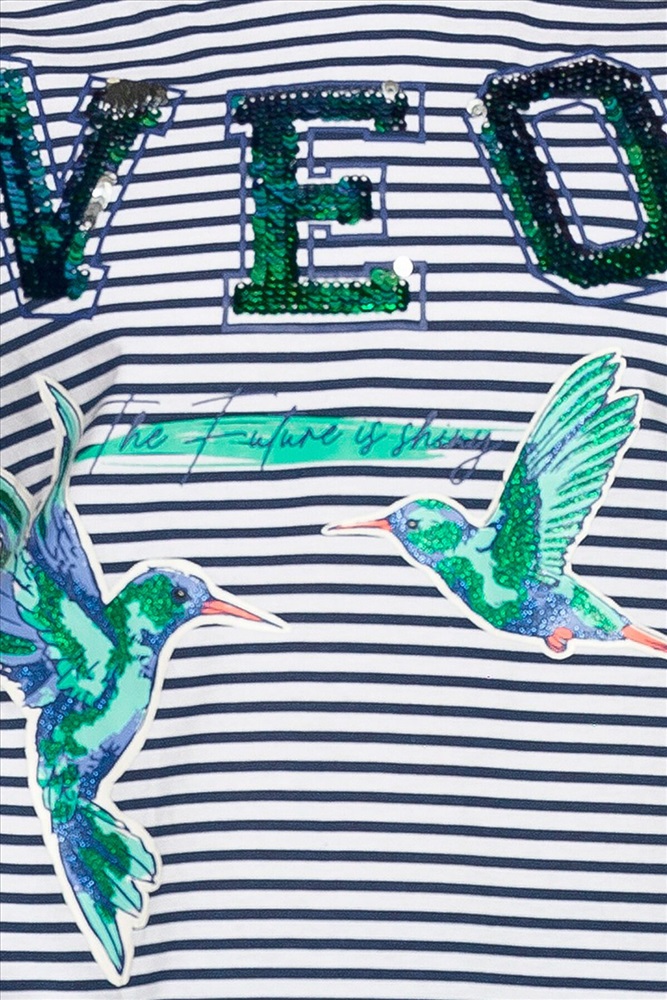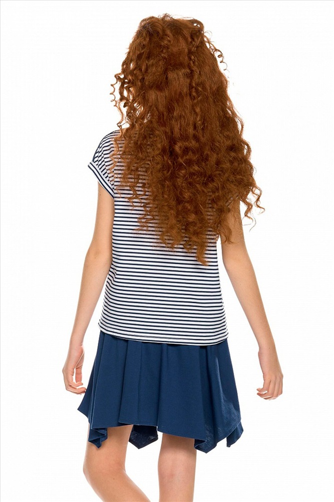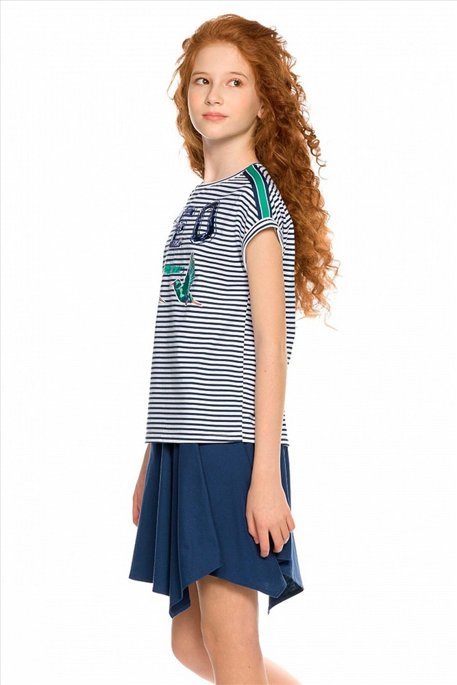 Комплект для девочек футболка и юбка. Футболка свободного объёма с цельнокроеным рукавом с отгибающейся закрепленной манжетой. Вдоль линии плеч настрочена декоративная трикотажная тесьма. По переду изделия принт с разноцветным глиттером в виде птичек колибри и надписи, перевод Блестящее будущее , и вышивка из переливающихся переворачивающихся пайеток. Юбка Новинка. Прямоугольная юбка с фигурной угловатой линией низа, пояс на широкой внутренней резинке.