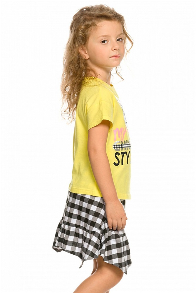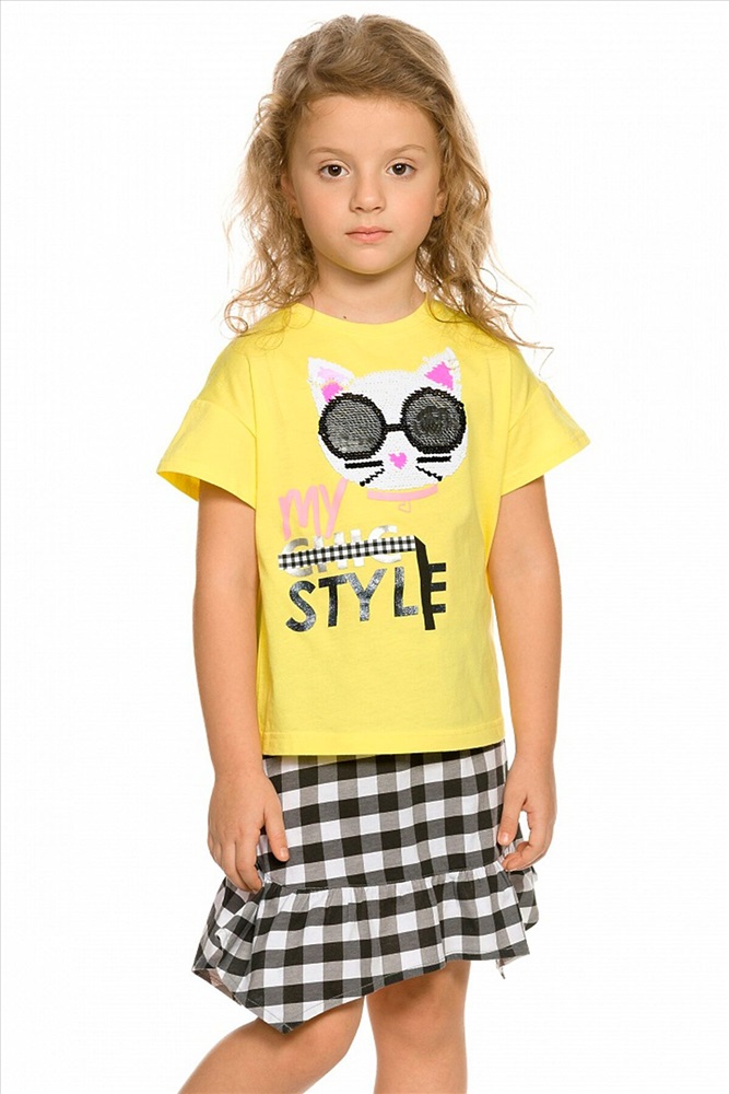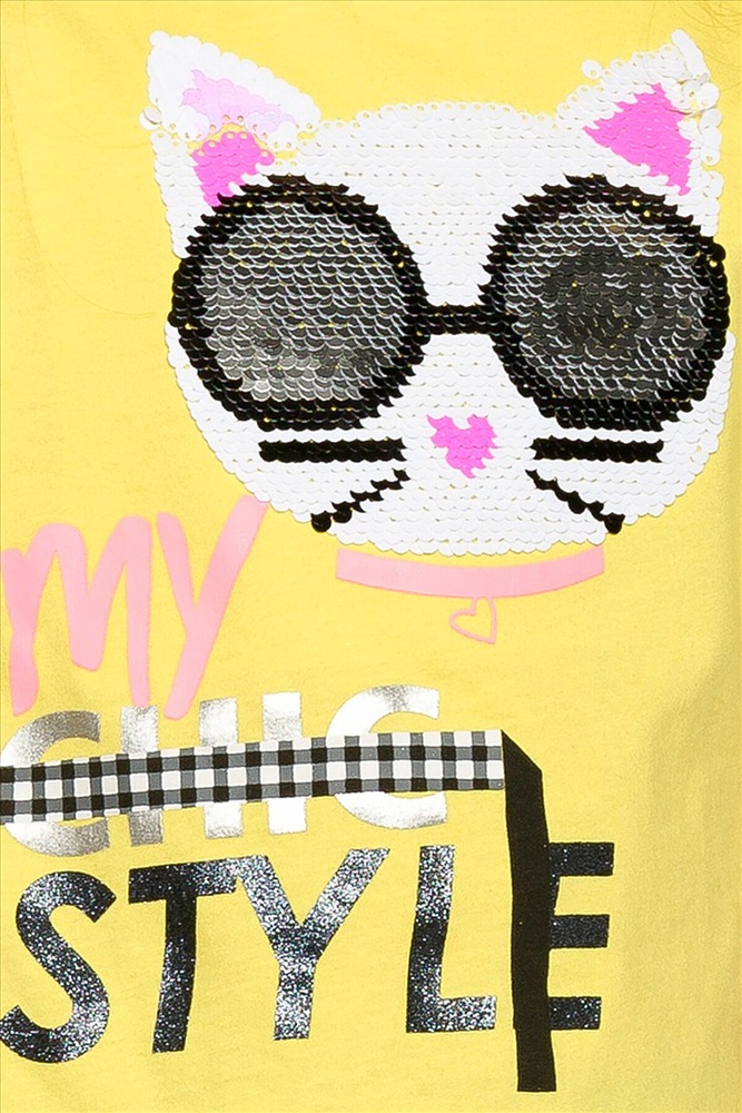 Комплект для девочек футболка и юбка. Футболка актуального мягкого оверсайз силуэта со спущенным плечом. Интерактивная аппликация из переворачивающихся пайеток кот подмигивает, когда пайетки перевернуты на вторую сторону. НеоНовый принт с металликом и глиттером, перевод Мой шикарный стиль. Юбка Новинка. Умеренный объем, по низу юбки пришит фигурный волан. Пояс на комфортной внутренней резинке.