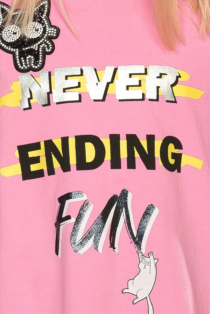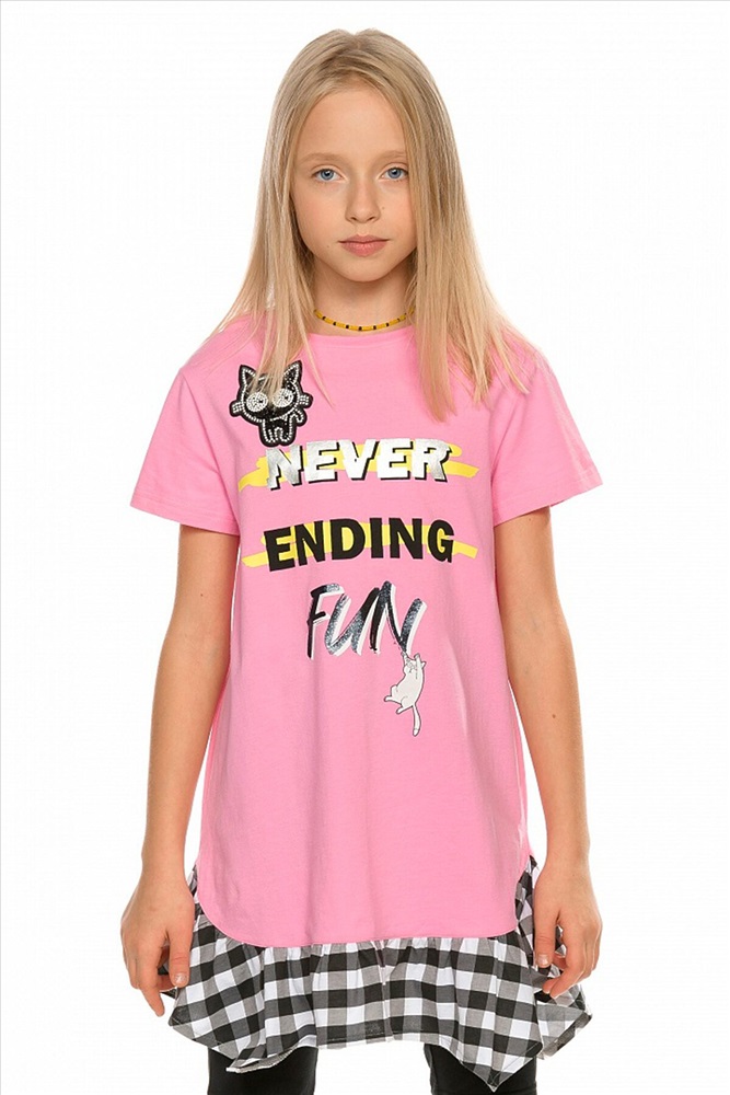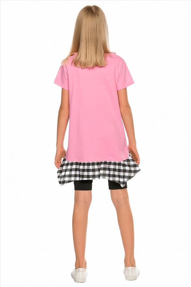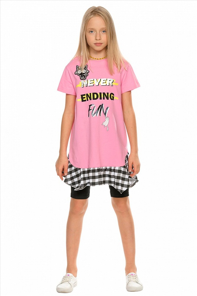 ID товара: 291726 Состав: Верх- Хлопок 100%; Низ- Хлопок 95%, Эластан 5% Сезон: Весна/Лето Длина: До колена Фасон: Полуприлегающий Рукав: Короткий Вид застежки: Нет Крой брючин: Облегающий Рисунок: Надпись Тип карманов: Без карманов Декоративные элементы: Печатный принт Основная ткань: Хлопок Стиль: Повседневный Страна бренда: Россия Страна производства: Россия Комплект для девочек туника и велосипедки. Новинка. Туника с круглым вырезом горловины, коротким втачным рукавом и фигурным клетчатым воланом по низу. Шрифтовая неоновая композиция с серебряным металликом и глиттером. Перевод Никогда не заканчивающееся веселье. Аппликация в виде котика из разноцветных страз. Велосипедки черного цвета длиной до колена. Комментарии к товару