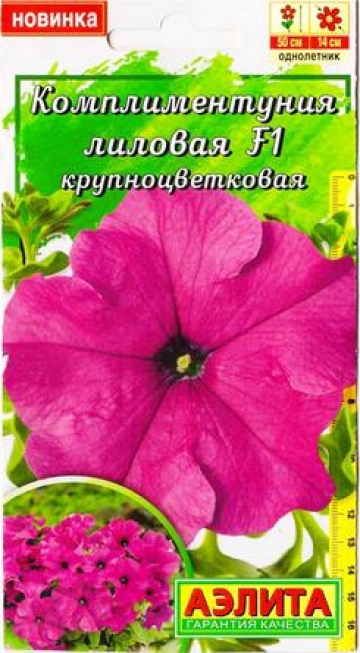 «Давайте говорить друг другу комплименты”. Когда трудно подобрать нужные слова, на помощь придут цветы. Комплиментуния – стильное, эффектное и очень изящное растение. Это романтичный, практичный выбор и комплимент на языке цветов. Комплиментуния – эксклюзивный гибрид (новая петуния) с крупными цветками и суперобильным цветением. Украсит любой цветник и будет долго дарить радость и восхищение. Благодаря наличию гена мужской стерильности семян не завязывает, направляя всю энергию на формирование новых цветков. Форма растений кустовая, со склонностью к трейлингу: ширина больше высоты. Высота 20-25 см, ширина 40-50 см. Быстро разрастается. Растения устойчивы к болезням, выдерживают дождливую и ветреную погоду, переносят кратковременные заморозки до –5°С и экстремальную жару до +40°С без потери декоративности.