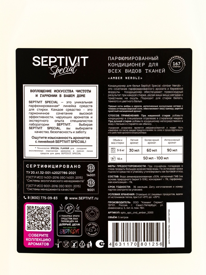Габариты: 17 x 12,5 x 30 Доставка: Платная Страна: Россия В боксе: 4 шт Состав: См. на упаковке Материалы: см. на упаковке Фасовка: по 1 шт Индивидуальная упаковка: Без упаковки Сертификат: Не подлежит сертификации Объём, л: 5 Погрузитесь в атмосферу утончённой свежести с кондиционером для белья Septivit Special «Amber Neroli». Его изысканный аромат с теплыми нотами амбры и нежным оттенком нероли придаст вашим вещам неповторимую мягкость и легкое благоухание, которое сохранится надолго. Кондиционер бережно ухаживает за тканями, облегчая глажку и продлевая жизнь любимым вещам, одновременно защищая их от износа и скатывания. Способ применения: Добавьте 50–70 мл кондиционера на один цикл полоскания в стиральной машине или растворите его в воде для ручной стирки. Тщательно прополощите бельё, затем высушите как обычно. Не наносите кондиционер непосредственно на ткань без разбавления. Используйте регулярно для сохранения мягкости и свежести ваших вещей. Комментарии к товару