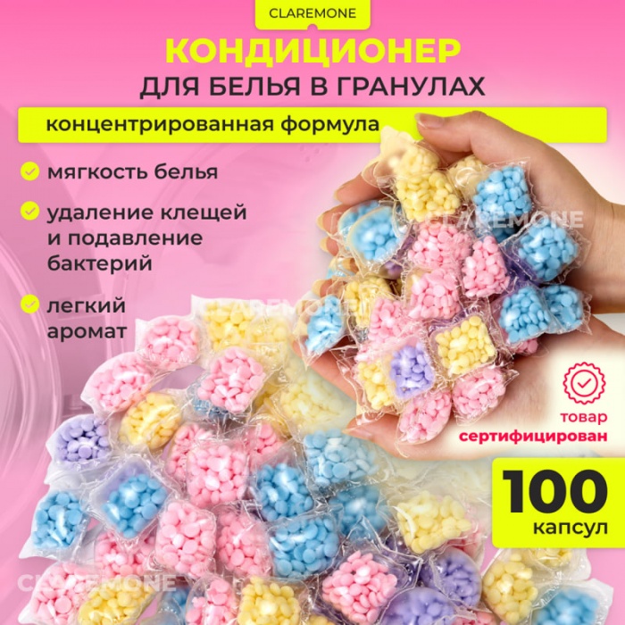 Кондиционер для белья в капсулах Ассорти ароматов (100 шт.)Подарите своим вещам мягкость и деликатный аромат с кондиционером в гранулах! В упаковке находится 100 капсул разных ароматов: лаванда, роза, морская свежесть, фрукты. Преимущества: Деликатный аромат: легкий и ненавязчивый запах. Минимум отдушек: идеально для тех, кто предпочитает мягкие ароматы. Мягкость и антистатический эффект: делает ткани приятными на ощупь и избавляет от наэлектризованности. Универсальность: подходит для всех типов тканей. Простота использования: гранулы быстро растворяются и легко выполаскиваются, не оставляя следов на одежде. Как использовать: 1. Положите нужное количество капсул в пустой барабан стиральной машины. 2. Загрузите вещи. 3. Дозируйте моющие средства как обычно. 4. Рекомендуем использовать 2 капсулы на полную загрузку стиральной машины (можно корректировать дозировку по предпочтению). Кондиционер для белья в гранулах — это простой способ придать вещам мягкость, свежесть и легкий аромат!Комментарии к товару